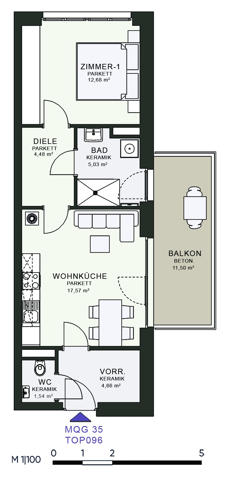 Das MQG wird als siebengeschossige bis zehngeschossige Hofstruktur realisiert und überzeugt durch eine hochwertige architektonische Umsetzung. Die vier Baukörper sind jeweils zweihüftig organisiert und über großzügige, bis zu acht Meter breite Längsatrien erschlossen, die als kommunikative Begegnungszonen dienen. Dank transparenter Glasüberdachungen sind diese Bereiche wettergeschützt und gleichzeitig lichtdurchflutet, wodurch eine angenehme Atmosphäre entsteht. Zudem ermöglicht dieses Konzept eine optimale Querlüftung aller Wohnungen.