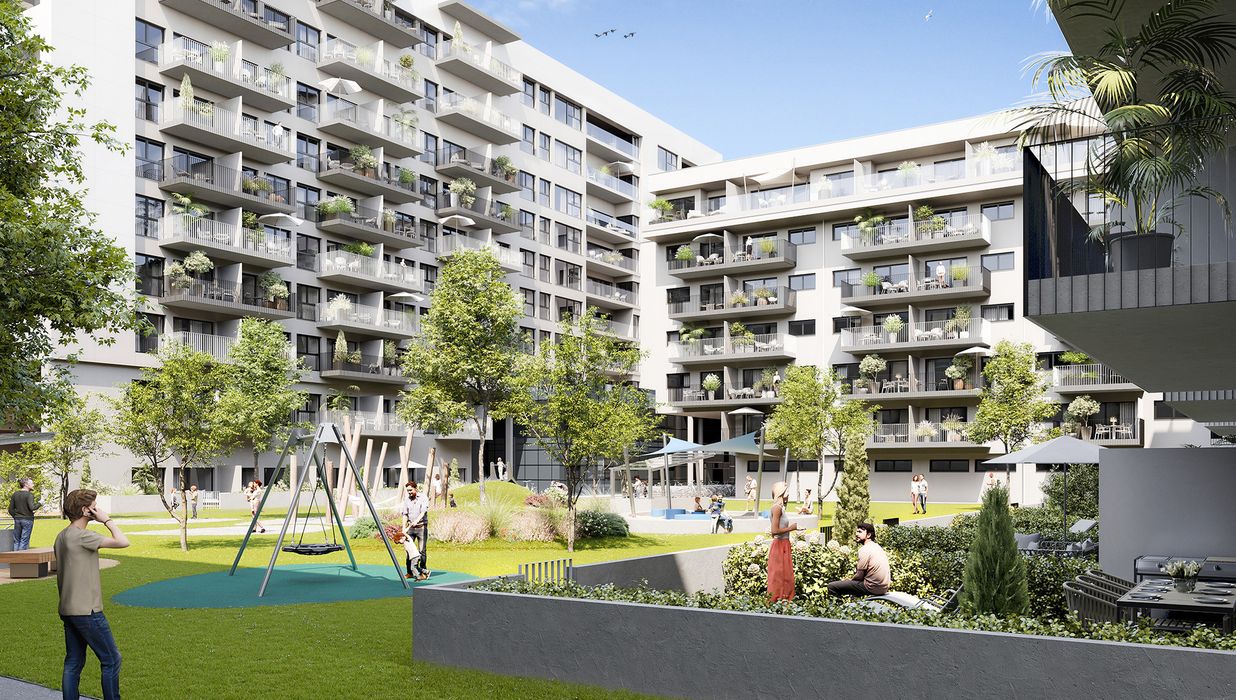 Im Erdgeschoss laden weitläufige Grünflächen sowie attraktiv gestaltete „Wohnstraßen“ mit Sitzmöglichkeiten zum Verweilen und Entspannen ein. Ergänzend dazu entsteht im östlichen Teil des Areals eine öffentlich zugängliche Parkanlage.