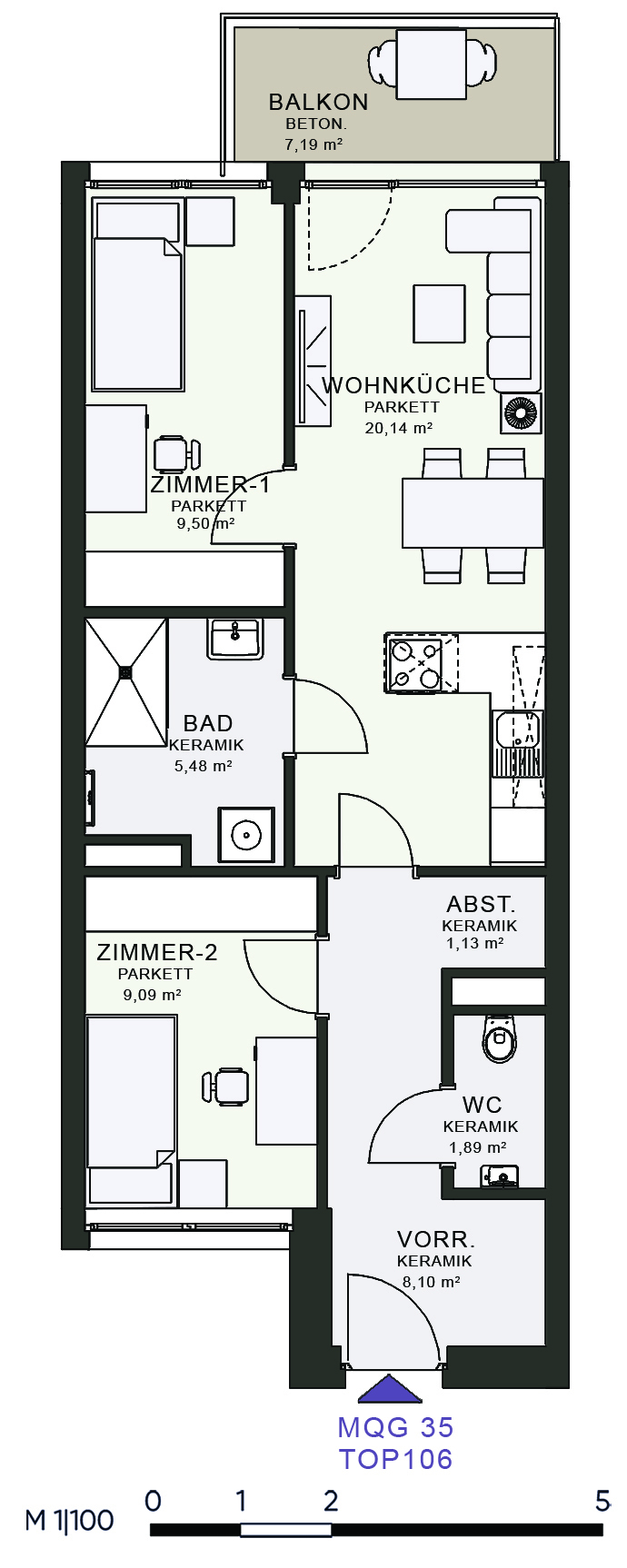 Das MQG wird als siebengeschossige bis zehngeschossige Hofstruktur realisiert und überzeugt durch eine hochwertige architektonische Umsetzung. Die vier Baukörper sind jeweils zweihüftig organisiert und über großzügige, bis zu acht Meter breite Längsatrien erschlossen, die als kommunikative Begegnungszonen dienen. Dank transparenter Glasüberdachungen sind diese Bereiche wettergeschützt und gleichzeitig lichtdurchflutet, wodurch eine angenehme Atmosphäre entsteht. Zudem ermöglicht dieses Konzept eine optimale Querlüftung aller Wohnungen.