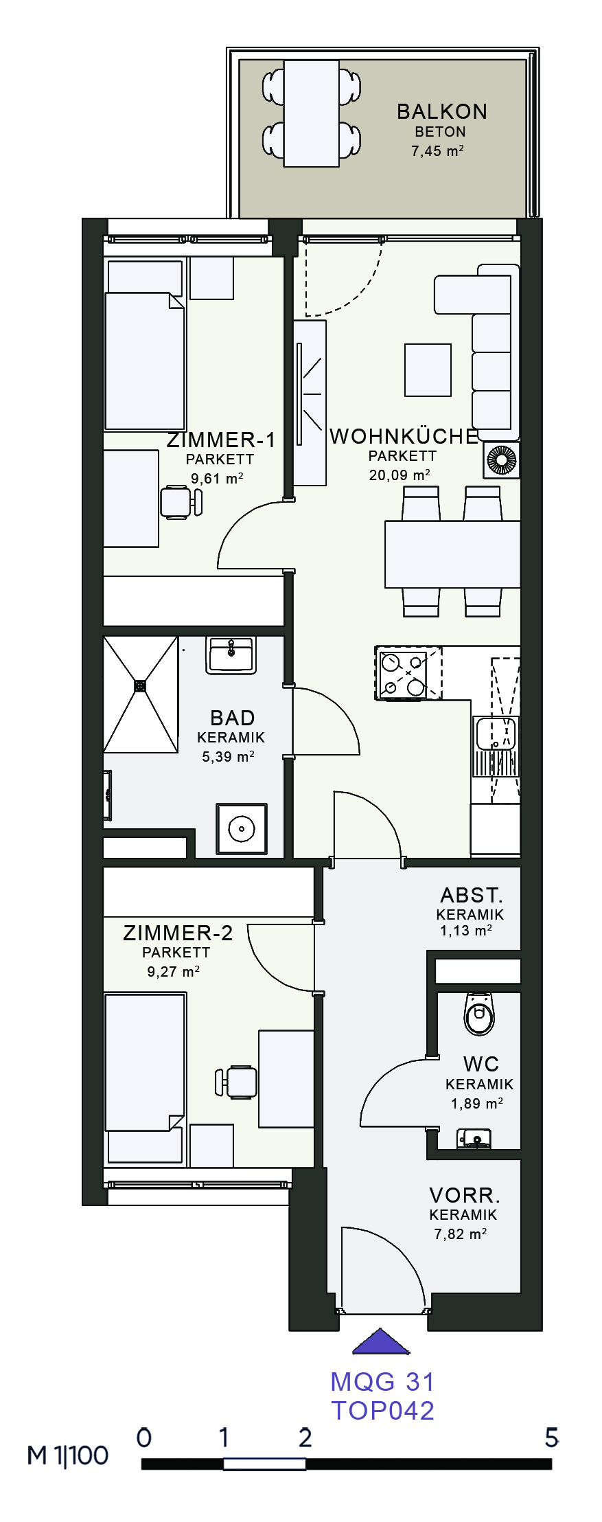 Das MQG wird als siebengeschossige bis zehngeschossige Hofstruktur realisiert und überzeugt durch eine hochwertige architektonische Umsetzung. Die vier Baukörper sind jeweils zweihüftig organisiert und über großzügige, bis zu acht Meter breite Längsatrien erschlossen, die als kommunikative Begegnungszonen dienen. Dank transparenter Glasüberdachungen sind diese Bereiche wettergeschützt und gleichzeitig lichtdurchflutet, wodurch eine angenehme Atmosphäre entsteht. Zudem ermöglicht dieses Konzept eine optimale Querlüftung aller Wohnungen.