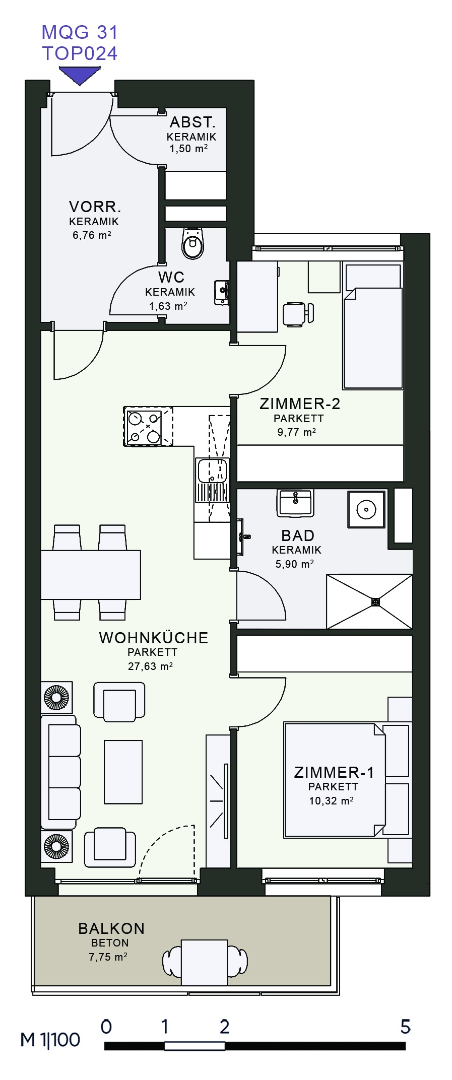 Das MQG wird als siebengeschossige bis zehngeschossige Hofstruktur realisiert und überzeugt durch eine hochwertige architektonische Umsetzung. Die vier Baukörper sind jeweils zweihüftig organisiert und über großzügige, bis zu acht Meter breite Längsatrien erschlossen, die als kommunikative Begegnungszonen dienen. Dank transparenter Glasüberdachungen sind diese Bereiche wettergeschützt und gleichzeitig lichtdurchflutet, wodurch eine angenehme Atmosphäre entsteht. Zudem ermöglicht dieses Konzept eine optimale Querlüftung aller Wohnungen.