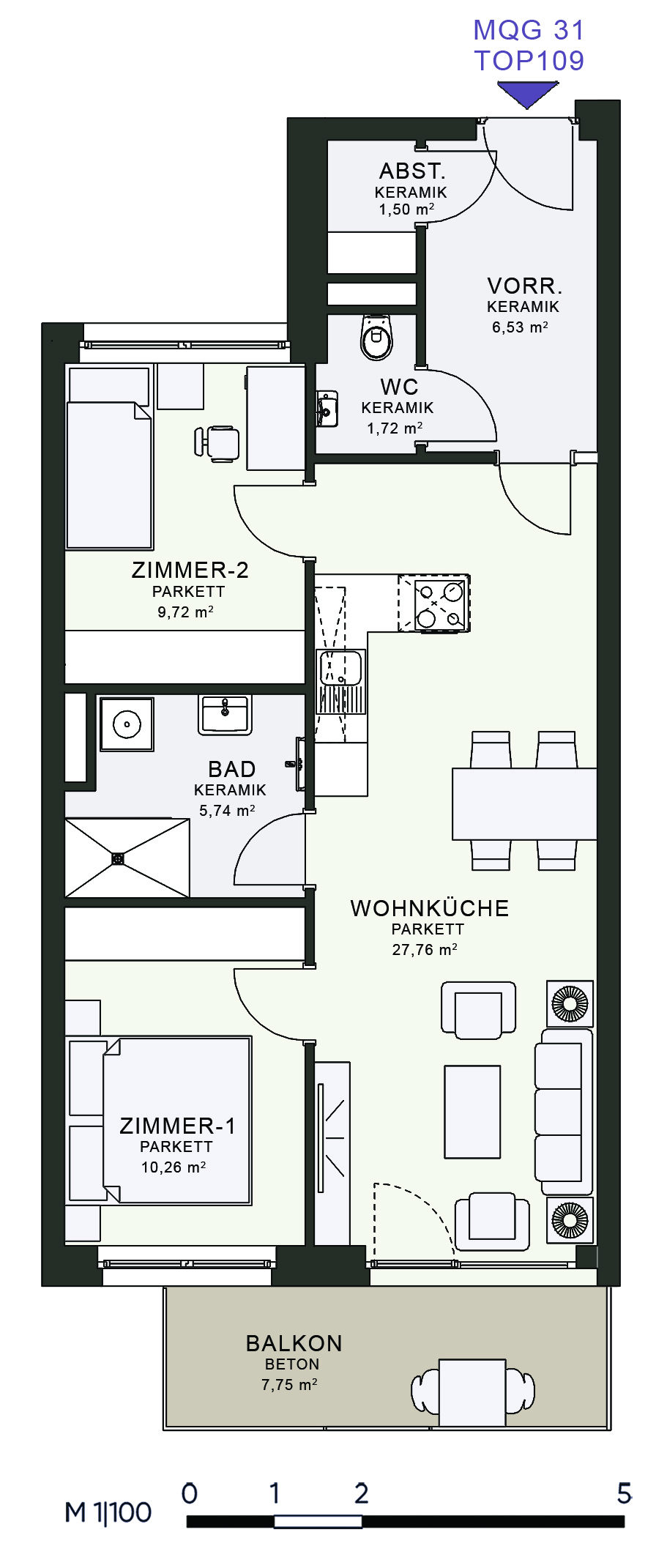 Das MQG wird als siebengeschossige bis zehngeschossige Hofstruktur realisiert und überzeugt durch eine hochwertige architektonische Umsetzung. Die vier Baukörper sind jeweils zweihüftig organisiert und über großzügige, bis zu acht Meter breite Längsatrien erschlossen, die als kommunikative Begegnungszonen dienen. Dank transparenter Glasüberdachungen sind diese Bereiche wettergeschützt und gleichzeitig lichtdurchflutet, wodurch eine angenehme Atmosphäre entsteht. Zudem ermöglicht dieses Konzept eine optimale Querlüftung aller Wohnungen.