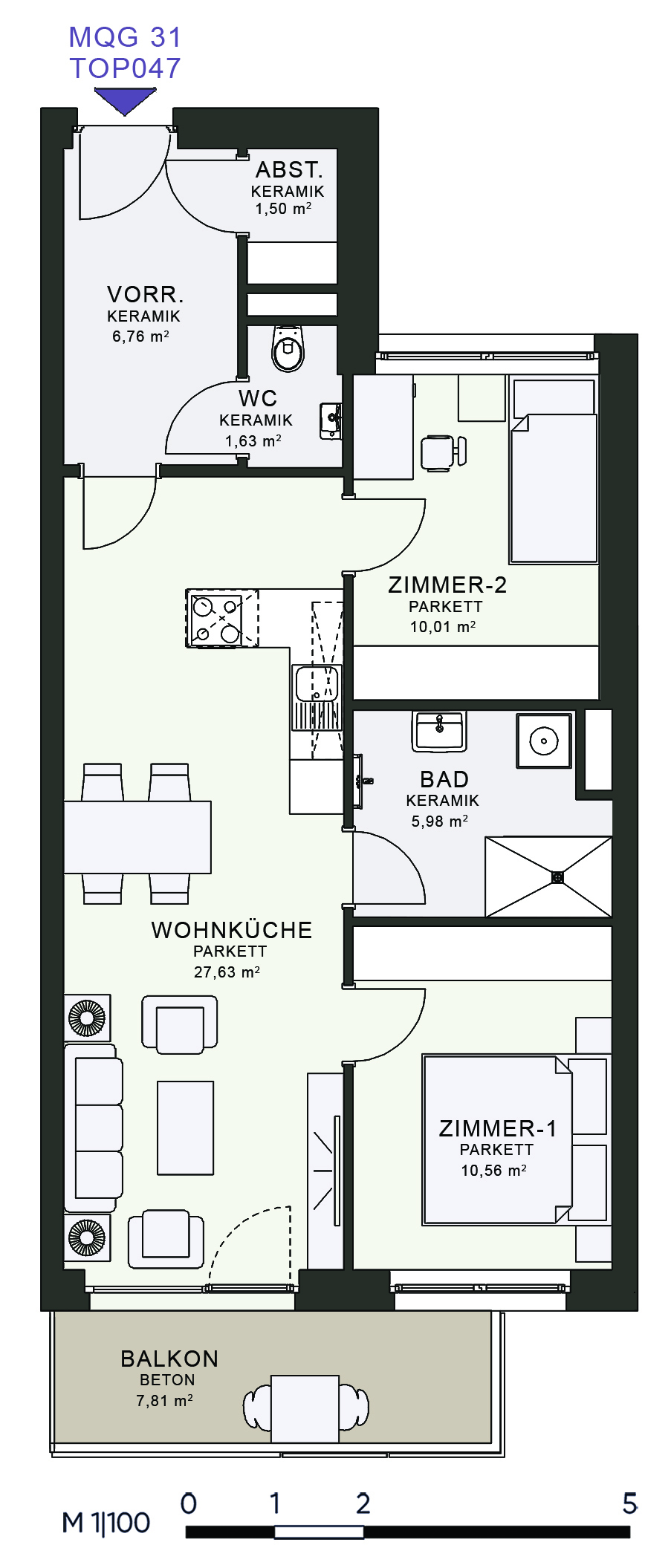 Das MQG wird als siebengeschossige bis zehngeschossige Hofstruktur realisiert und überzeugt durch eine hochwertige architektonische Umsetzung. Die vier Baukörper sind jeweils zweihüftig organisiert und über großzügige, bis zu acht Meter breite Längsatrien erschlossen, die als kommunikative Begegnungszonen dienen. Dank transparenter Glasüberdachungen sind diese Bereiche wettergeschützt und gleichzeitig lichtdurchflutet, wodurch eine angenehme Atmosphäre entsteht. Zudem ermöglicht dieses Konzept eine optimale Querlüftung aller Wohnungen.