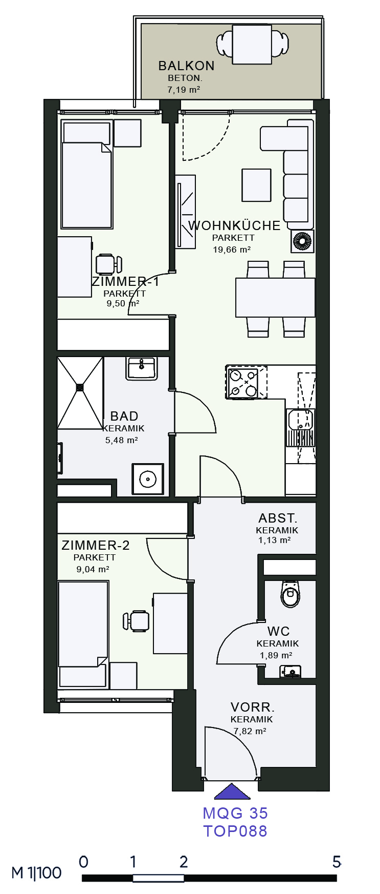 Das MQG wird als siebengeschossige bis zehngeschossige Hofstruktur realisiert und überzeugt durch eine hochwertige architektonische Umsetzung. Die vier Baukörper sind jeweils zweihüftig organisiert und über großzügige, bis zu acht Meter breite Längsatrien erschlossen, die als kommunikative Begegnungszonen dienen. Dank transparenter Glasüberdachungen sind diese Bereiche wettergeschützt und gleichzeitig lichtdurchflutet, wodurch eine angenehme Atmosphäre entsteht. Zudem ermöglicht dieses Konzept eine optimale Querlüftung aller Wohnungen.