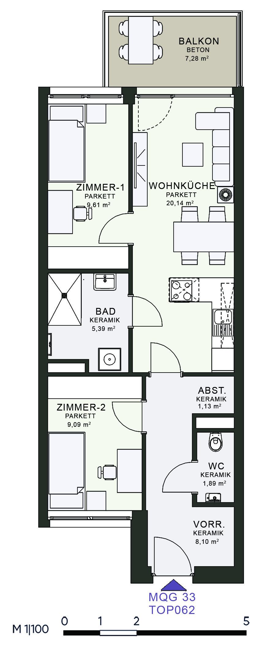 Das MQG wird als siebengeschossige bis zehngeschossige Hofstruktur realisiert und überzeugt durch eine hochwertige architektonische Umsetzung. Die vier Baukörper sind jeweils zweihüftig organisiert und über großzügige, bis zu acht Meter breite Längsatrien erschlossen, die als kommunikative Begegnungszonen dienen. Dank transparenter Glasüberdachungen sind diese Bereiche wettergeschützt und gleichzeitig lichtdurchflutet, wodurch eine angenehme Atmosphäre entsteht. Zudem ermöglicht dieses Konzept eine optimale Querlüftung aller Wohnungen.