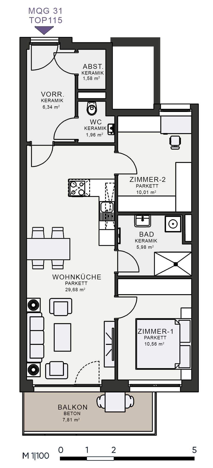 Das MQG wird als siebengeschossige bis zehngeschossige Hofstruktur realisiert und überzeugt durch eine hochwertige architektonische Umsetzung. Die vier Baukörper sind jeweils zweihüftig organisiert und über großzügige, bis zu acht Meter breite Längsatrien erschlossen, die als kommunikative Begegnungszonen dienen. Dank transparenter Glasüberdachungen sind diese Bereiche wettergeschützt und gleichzeitig lichtdurchflutet, wodurch eine angenehme Atmosphäre entsteht. Zudem ermöglicht dieses Konzept eine optimale Querlüftung aller Wohnungen.