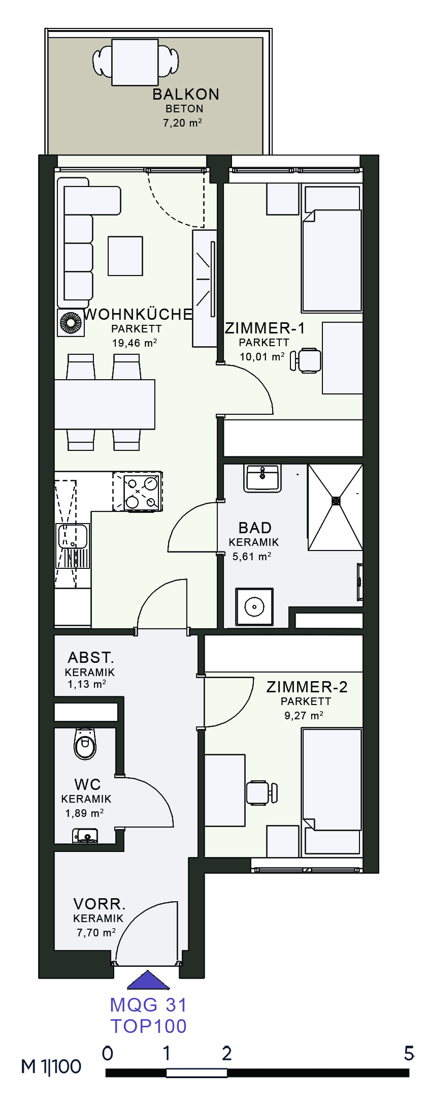 Das MQG wird als siebengeschossige bis zehngeschossige Hofstruktur realisiert und überzeugt durch eine hochwertige architektonische Umsetzung. Die vier Baukörper sind jeweils zweihüftig organisiert und über großzügige, bis zu acht Meter breite Längsatrien erschlossen, die als kommunikative Begegnungszonen dienen. Dank transparenter Glasüberdachungen sind diese Bereiche wettergeschützt und gleichzeitig lichtdurchflutet, wodurch eine angenehme Atmosphäre entsteht. Zudem ermöglicht dieses Konzept eine optimale Querlüftung aller Wohnungen.