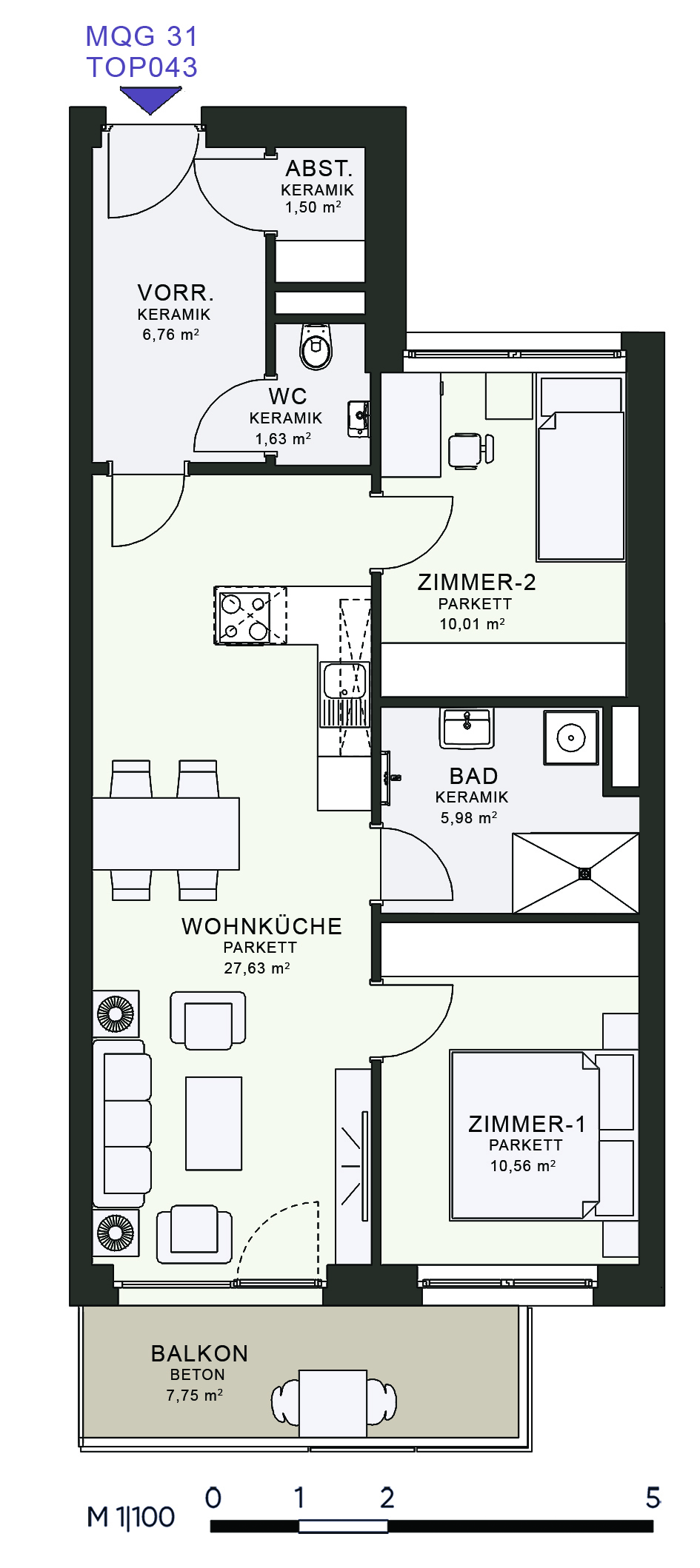 Das MQG wird als siebengeschossige bis zehngeschossige Hofstruktur realisiert und überzeugt durch eine hochwertige architektonische Umsetzung. Die vier Baukörper sind jeweils zweihüftig organisiert und über großzügige, bis zu acht Meter breite Längsatrien erschlossen, die als kommunikative Begegnungszonen dienen. Dank transparenter Glasüberdachungen sind diese Bereiche wettergeschützt und gleichzeitig lichtdurchflutet, wodurch eine angenehme Atmosphäre entsteht. Zudem ermöglicht dieses Konzept eine optimale Querlüftung aller Wohnungen.