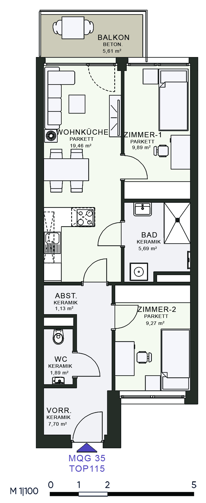 Das MQG wird als siebengeschossige bis zehngeschossige Hofstruktur realisiert und überzeugt durch eine hochwertige architektonische Umsetzung. Die vier Baukörper sind jeweils zweihüftig organisiert und über großzügige, bis zu acht Meter breite Längsatrien erschlossen, die als kommunikative Begegnungszonen dienen. Dank transparenter Glasüberdachungen sind diese Bereiche wettergeschützt und gleichzeitig lichtdurchflutet, wodurch eine angenehme Atmosphäre entsteht. Zudem ermöglicht dieses Konzept eine optimale Querlüftung aller Wohnungen.