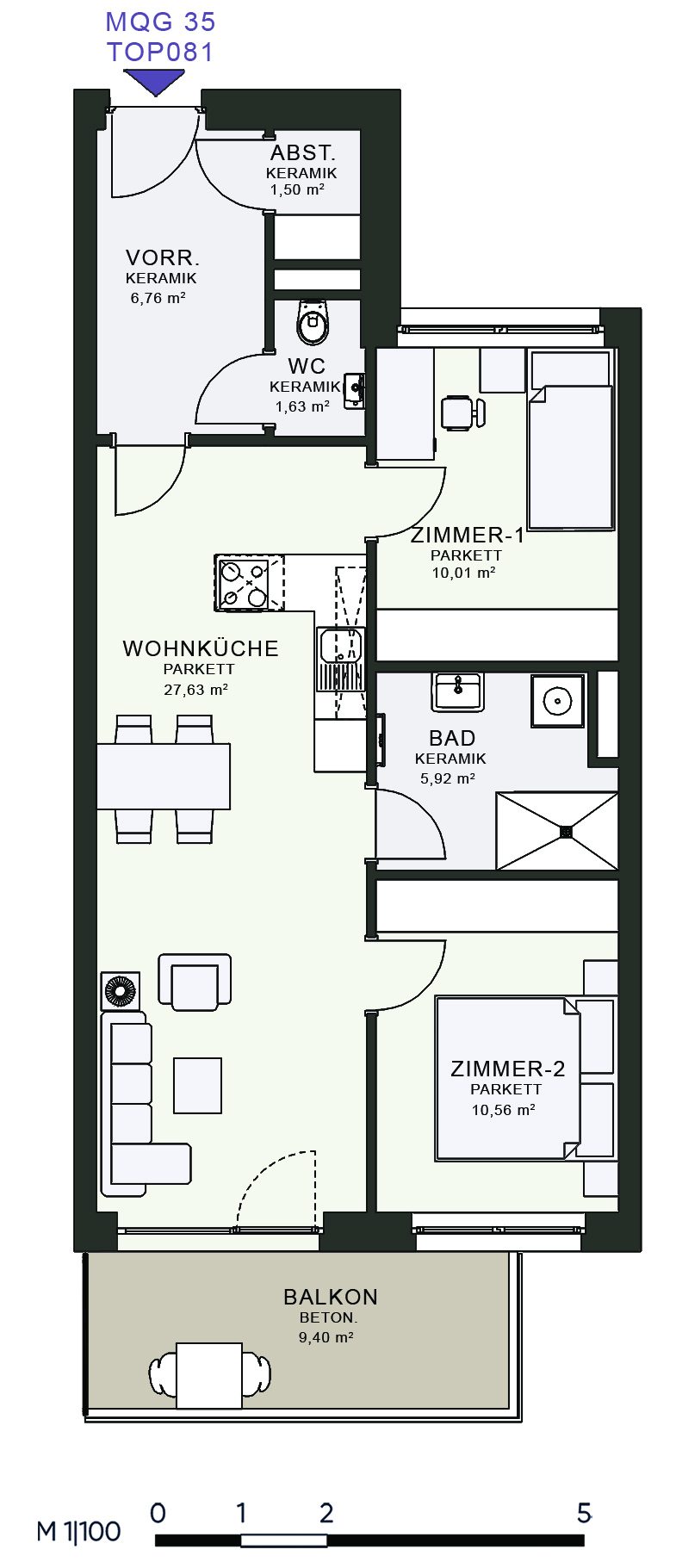 Das MQG wird als siebengeschossige bis zehngeschossige Hofstruktur realisiert und überzeugt durch eine hochwertige architektonische Umsetzung. Die vier Baukörper sind jeweils zweihüftig organisiert und über großzügige, bis zu acht Meter breite Längsatrien erschlossen, die als kommunikative Begegnungszonen dienen. Dank transparenter Glasüberdachungen sind diese Bereiche wettergeschützt und gleichzeitig lichtdurchflutet, wodurch eine angenehme Atmosphäre entsteht. Zudem ermöglicht dieses Konzept eine optimale Querlüftung aller Wohnungen.
