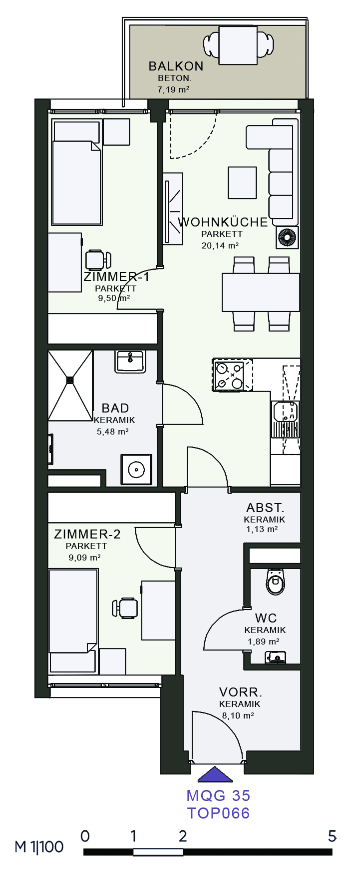 Das MQG wird als siebengeschossige bis zehngeschossige Hofstruktur realisiert und überzeugt durch eine hochwertige architektonische Umsetzung. Die vier Baukörper sind jeweils zweihüftig organisiert und über großzügige, bis zu acht Meter breite Längsatrien erschlossen, die als kommunikative Begegnungszonen dienen. Dank transparenter Glasüberdachungen sind diese Bereiche wettergeschützt und gleichzeitig lichtdurchflutet, wodurch eine angenehme Atmosphäre entsteht. Zudem ermöglicht dieses Konzept eine optimale Querlüftung aller Wohnungen.