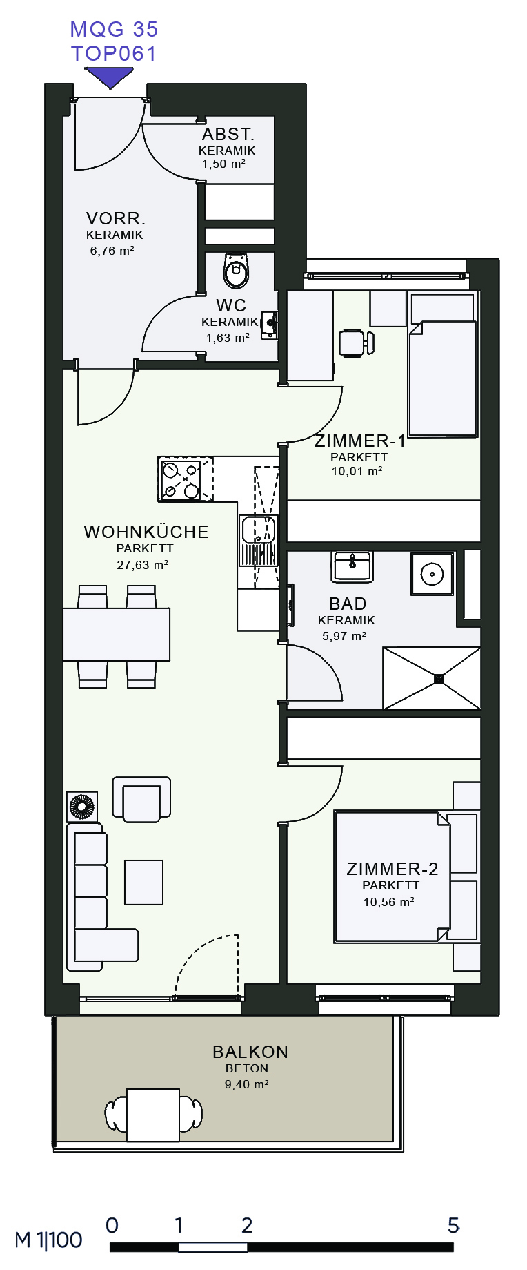 Das MQG wird als siebengeschossige bis zehngeschossige Hofstruktur realisiert und überzeugt durch eine hochwertige architektonische Umsetzung. Die vier Baukörper sind jeweils zweihüftig organisiert und über großzügige, bis zu acht Meter breite Längsatrien erschlossen, die als kommunikative Begegnungszonen dienen. Dank transparenter Glasüberdachungen sind diese Bereiche wettergeschützt und gleichzeitig lichtdurchflutet, wodurch eine angenehme Atmosphäre entsteht. Zudem ermöglicht dieses Konzept eine optimale Querlüftung aller Wohnungen.