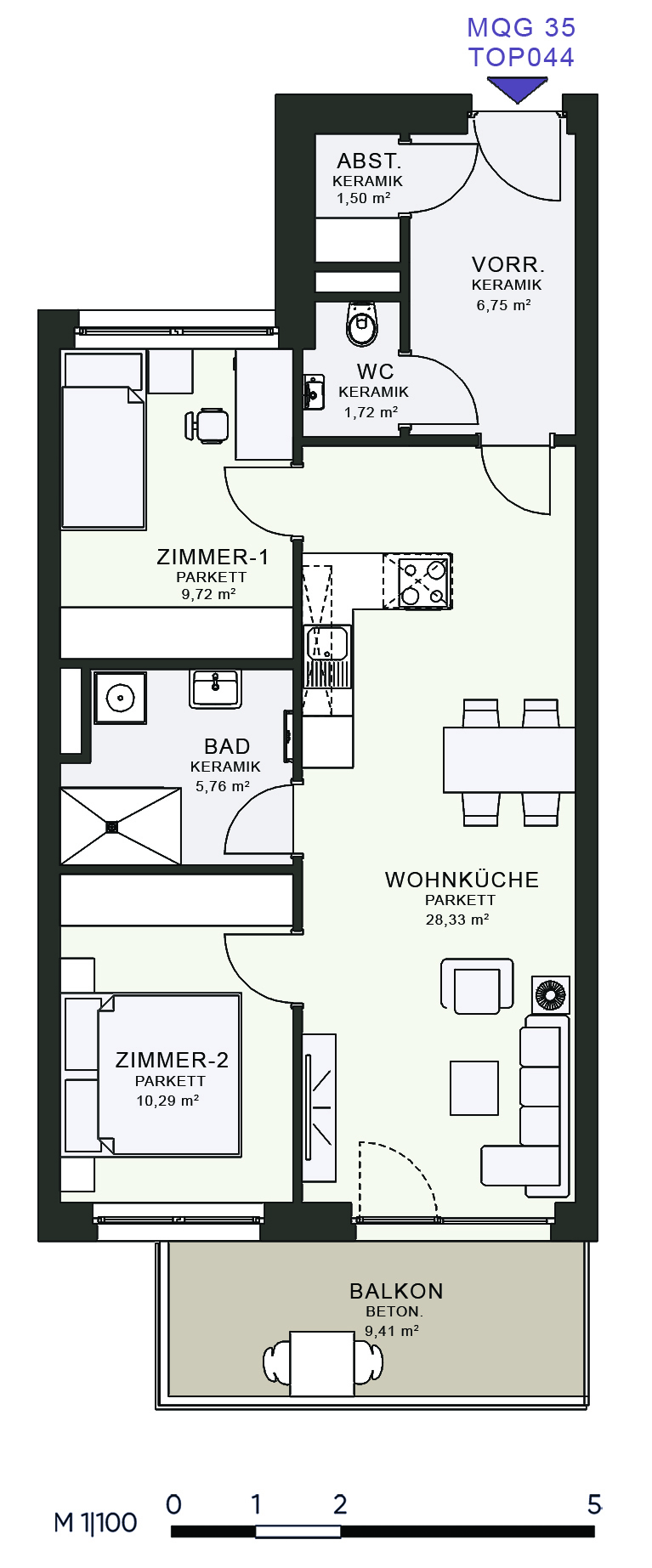 Das MQG wird als siebengeschossige bis zehngeschossige Hofstruktur realisiert und überzeugt durch eine hochwertige architektonische Umsetzung. Die vier Baukörper sind jeweils zweihüftig organisiert und über großzügige, bis zu acht Meter breite Längsatrien erschlossen, die als kommunikative Begegnungszonen dienen. Dank transparenter Glasüberdachungen sind diese Bereiche wettergeschützt und gleichzeitig lichtdurchflutet, wodurch eine angenehme Atmosphäre entsteht. Zudem ermöglicht dieses Konzept eine optimale Querlüftung aller Wohnungen.