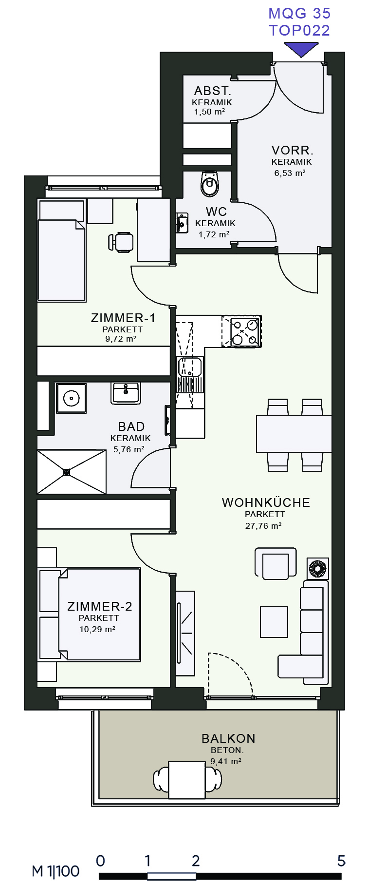 Das MQG wird als siebengeschossige bis zehngeschossige Hofstruktur realisiert und überzeugt durch eine hochwertige architektonische Umsetzung. Die vier Baukörper sind jeweils zweihüftig organisiert und über großzügige, bis zu acht Meter breite Längsatrien erschlossen, die als kommunikative Begegnungszonen dienen. Dank transparenter Glasüberdachungen sind diese Bereiche wettergeschützt und gleichzeitig lichtdurchflutet, wodurch eine angenehme Atmosphäre entsteht. Zudem ermöglicht dieses Konzept eine optimale Querlüftung aller Wohnungen.