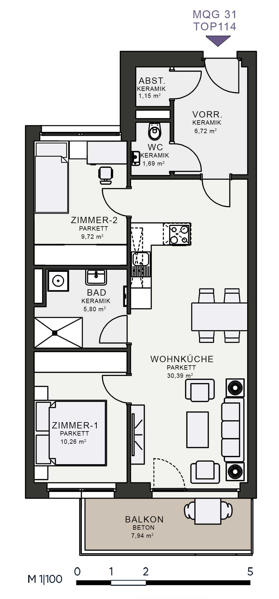 Das MQG wird als siebengeschossige bis zehngeschossige Hofstruktur realisiert und überzeugt durch eine hochwertige architektonische Umsetzung. Die vier Baukörper sind jeweils zweihüftig organisiert und über großzügige, bis zu acht Meter breite Längsatrien erschlossen, die als kommunikative Begegnungszonen dienen. Dank transparenter Glasüberdachungen sind diese Bereiche wettergeschützt und gleichzeitig lichtdurchflutet, wodurch eine angenehme Atmosphäre entsteht. Zudem ermöglicht dieses Konzept eine optimale Querlüftung aller Wohnungen.