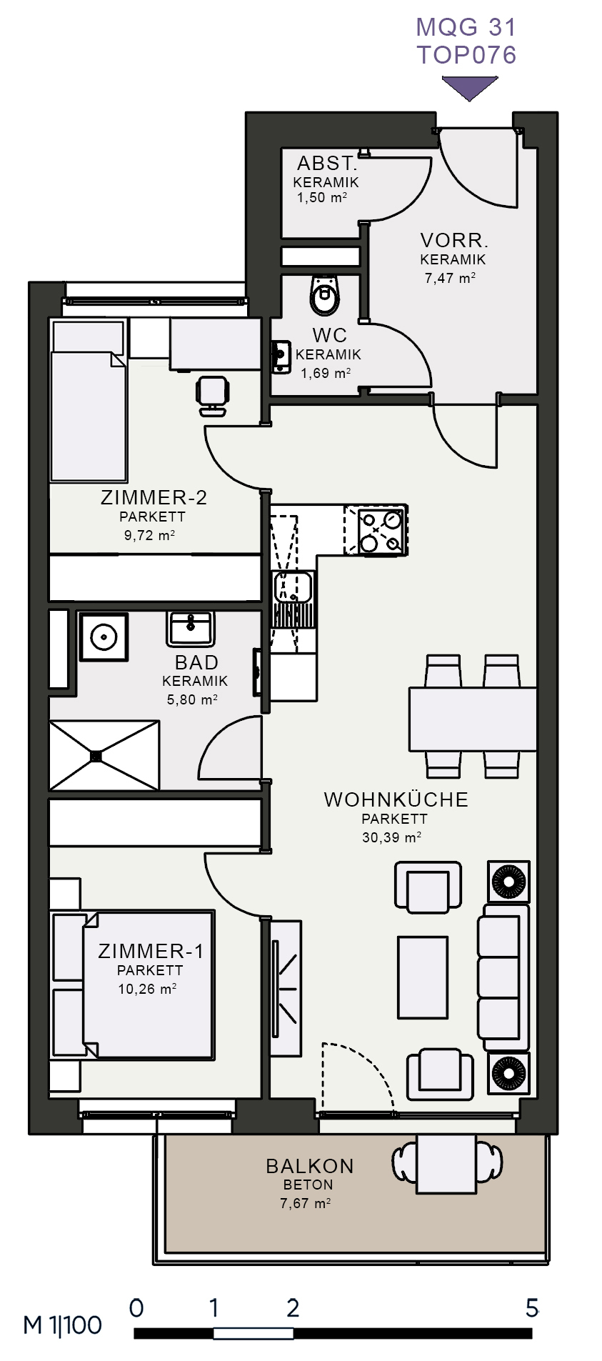 Das MQG wird als siebengeschossige bis zehngeschossige Hofstruktur realisiert und überzeugt durch eine hochwertige architektonische Umsetzung. Die vier Baukörper sind jeweils zweihüftig organisiert und über großzügige, bis zu acht Meter breite Längsatrien erschlossen, die als kommunikative Begegnungszonen dienen. Dank transparenter Glasüberdachungen sind diese Bereiche wettergeschützt und gleichzeitig lichtdurchflutet, wodurch eine angenehme Atmosphäre entsteht. Zudem ermöglicht dieses Konzept eine optimale Querlüftung aller Wohnungen.