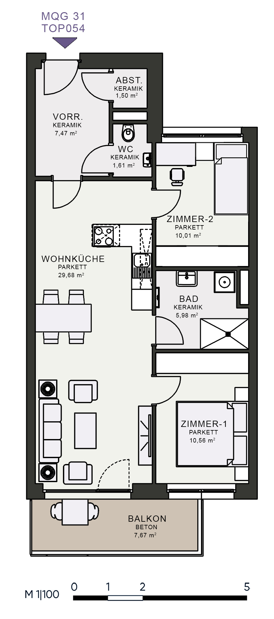 Das MQG wird als siebengeschossige bis zehngeschossige Hofstruktur realisiert und überzeugt durch eine hochwertige architektonische Umsetzung. Die vier Baukörper sind jeweils zweihüftig organisiert und über großzügige, bis zu acht Meter breite Längsatrien erschlossen, die als kommunikative Begegnungszonen dienen. Dank transparenter Glasüberdachungen sind diese Bereiche wettergeschützt und gleichzeitig lichtdurchflutet, wodurch eine angenehme Atmosphäre entsteht. Zudem ermöglicht dieses Konzept eine optimale Querlüftung aller Wohnungen.