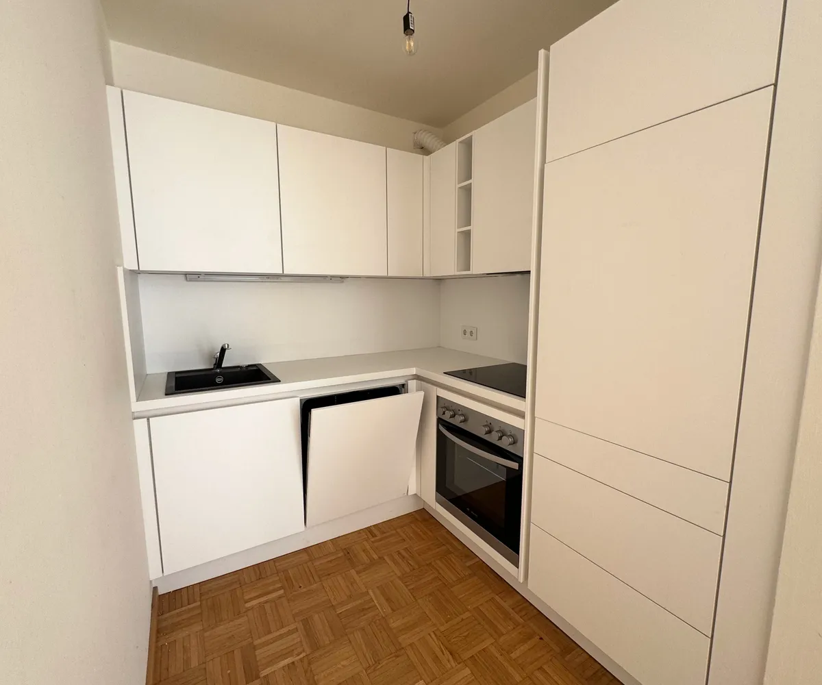 Die Wohnung selbst unterteilt sich in eine geräumige Wohnküche mit bestens ausgestatteter Einbauküche, ein separat begehbares Schlafzimmer, ein Badezimmer mit Dusche und ein WC, sowie in einen Vorraum.