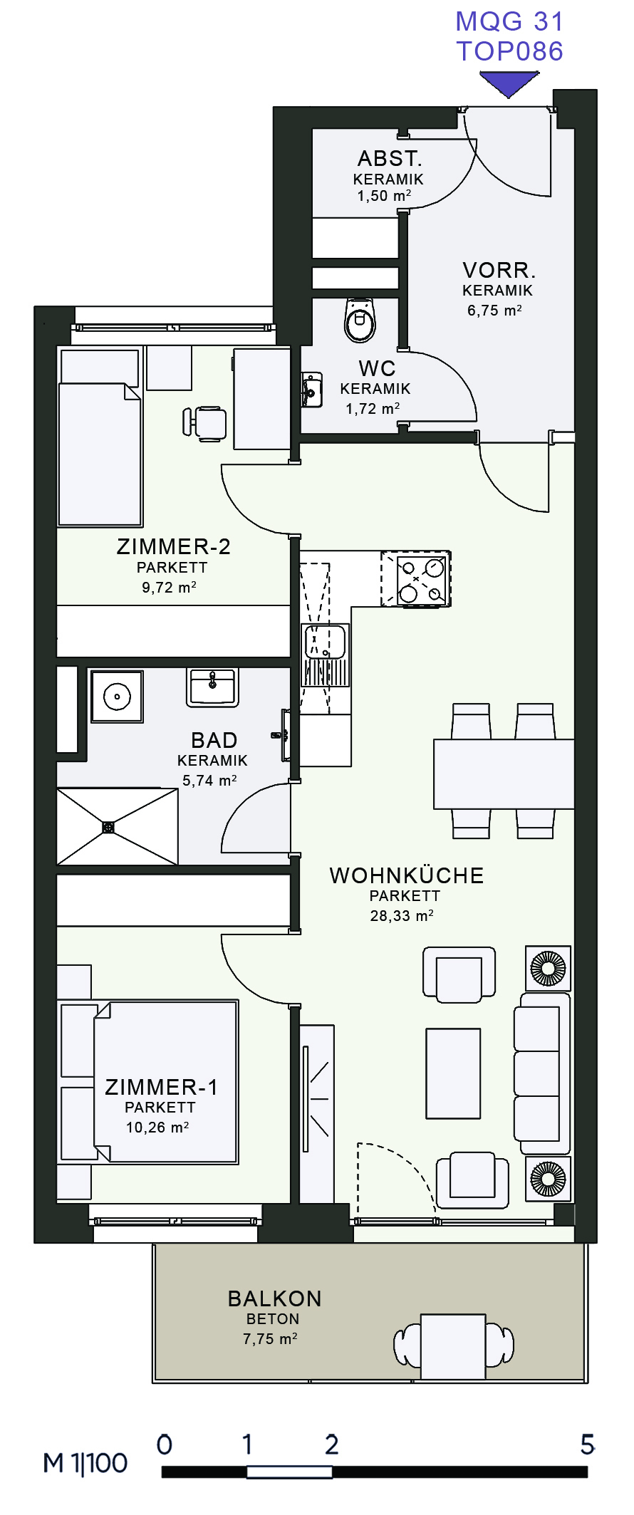 Das MQG wird als siebengeschossige bis zehngeschossige Hofstruktur realisiert und überzeugt durch eine hochwertige architektonische Umsetzung. Die vier Baukörper sind jeweils zweihüftig organisiert und über großzügige, bis zu acht Meter breite Längsatrien erschlossen, die als kommunikative Begegnungszonen dienen. Dank transparenter Glasüberdachungen sind diese Bereiche wettergeschützt und gleichzeitig lichtdurchflutet, wodurch eine angenehme Atmosphäre entsteht. Zudem ermöglicht dieses Konzept eine optimale Querlüftung aller Wohnungen.