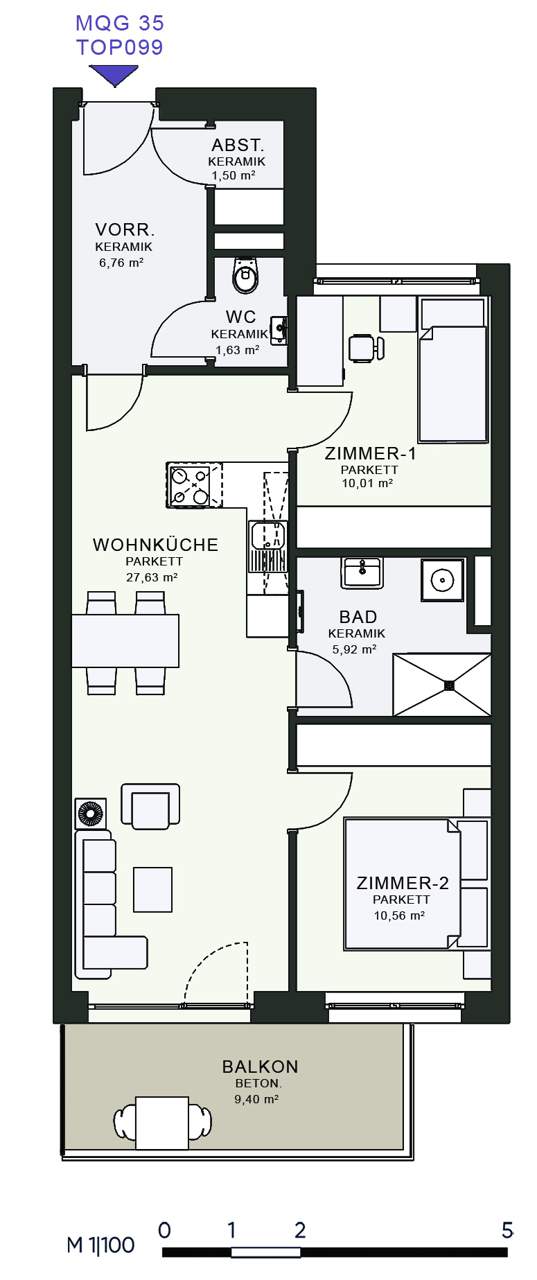 Das MQG wird als siebengeschossige bis zehngeschossige Hofstruktur realisiert und überzeugt durch eine hochwertige architektonische Umsetzung. Die vier Baukörper sind jeweils zweihüftig organisiert und über großzügige, bis zu acht Meter breite Längsatrien erschlossen, die als kommunikative Begegnungszonen dienen. Dank transparenter Glasüberdachungen sind diese Bereiche wettergeschützt und gleichzeitig lichtdurchflutet, wodurch eine angenehme Atmosphäre entsteht. Zudem ermöglicht dieses Konzept eine optimale Querlüftung aller Wohnungen.