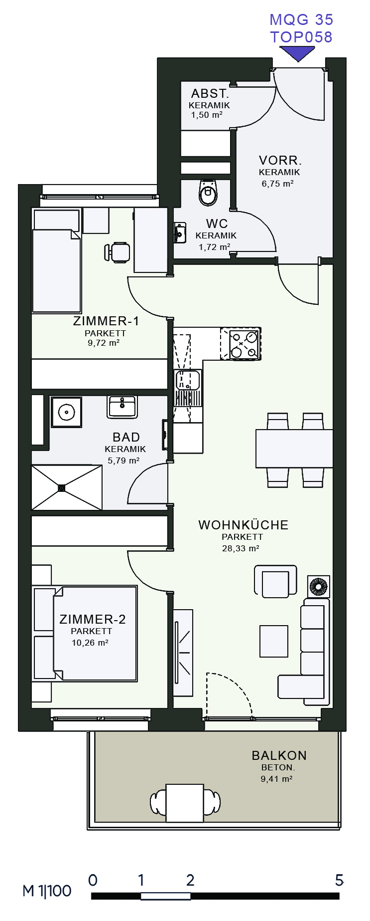 Das MQG wird als siebengeschossige bis zehngeschossige Hofstruktur realisiert und überzeugt durch eine hochwertige architektonische Umsetzung. Die vier Baukörper sind jeweils zweihüftig organisiert und über großzügige, bis zu acht Meter breite Längsatrien erschlossen, die als kommunikative Begegnungszonen dienen. Dank transparenter Glasüberdachungen sind diese Bereiche wettergeschützt und gleichzeitig lichtdurchflutet, wodurch eine angenehme Atmosphäre entsteht. Zudem ermöglicht dieses Konzept eine optimale Querlüftung aller Wohnungen.