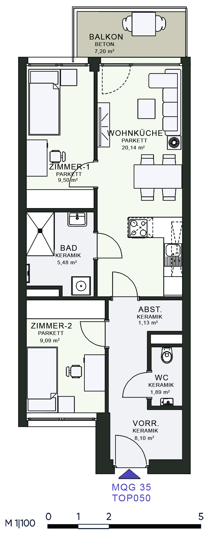 Das MQG wird als siebengeschossige bis zehngeschossige Hofstruktur realisiert und überzeugt durch eine hochwertige architektonische Umsetzung. Die vier Baukörper sind jeweils zweihüftig organisiert und über großzügige, bis zu acht Meter breite Längsatrien erschlossen, die als kommunikative Begegnungszonen dienen. Dank transparenter Glasüberdachungen sind diese Bereiche wettergeschützt und gleichzeitig lichtdurchflutet, wodurch eine angenehme Atmosphäre entsteht. Zudem ermöglicht dieses Konzept eine optimale Querlüftung aller Wohnungen.