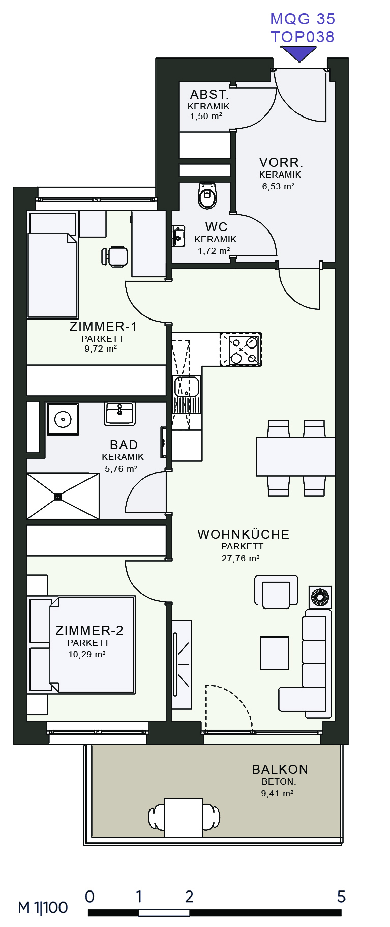 Das MQG wird als siebengeschossige bis zehngeschossige Hofstruktur realisiert und überzeugt durch eine hochwertige architektonische Umsetzung. Die vier Baukörper sind jeweils zweihüftig organisiert und über großzügige, bis zu acht Meter breite Längsatrien erschlossen, die als kommunikative Begegnungszonen dienen. Dank transparenter Glasüberdachungen sind diese Bereiche wettergeschützt und gleichzeitig lichtdurchflutet, wodurch eine angenehme Atmosphäre entsteht. Zudem ermöglicht dieses Konzept eine optimale Querlüftung aller Wohnungen.