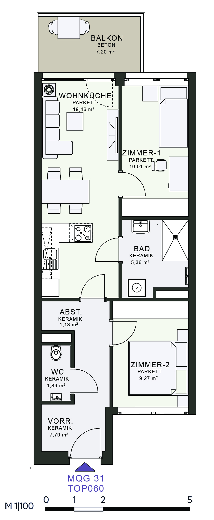 Das MQG wird als siebengeschossige bis zehngeschossige Hofstruktur realisiert und überzeugt durch eine hochwertige architektonische Umsetzung. Die vier Baukörper sind jeweils zweihüftig organisiert und über großzügige, bis zu acht Meter breite Längsatrien erschlossen, die als kommunikative Begegnungszonen dienen. Dank transparenter Glasüberdachungen sind diese Bereiche wettergeschützt und gleichzeitig lichtdurchflutet, wodurch eine angenehme Atmosphäre entsteht. Zudem ermöglicht dieses Konzept eine optimale Querlüftung aller Wohnungen.