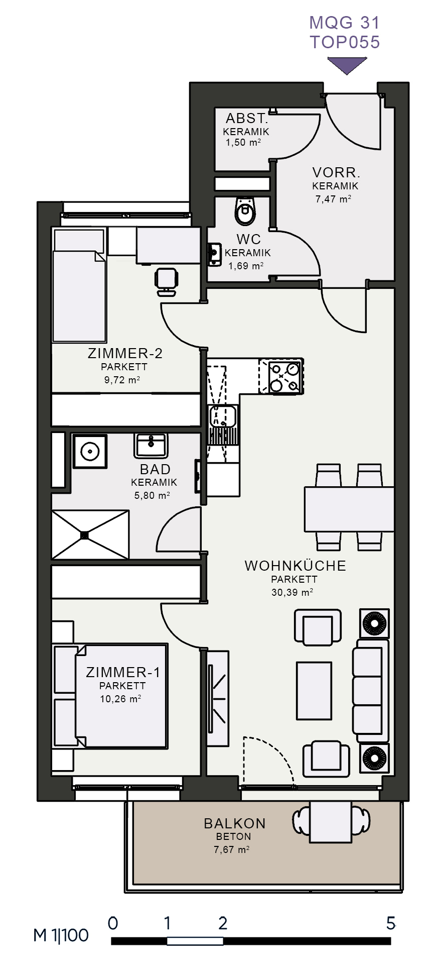 Das MQG wird als siebengeschossige bis zehngeschossige Hofstruktur realisiert und überzeugt durch eine hochwertige architektonische Umsetzung. Die vier Baukörper sind jeweils zweihüftig organisiert und über großzügige, bis zu acht Meter breite Längsatrien erschlossen, die als kommunikative Begegnungszonen dienen. Dank transparenter Glasüberdachungen sind diese Bereiche wettergeschützt und gleichzeitig lichtdurchflutet, wodurch eine angenehme Atmosphäre entsteht. Zudem ermöglicht dieses Konzept eine optimale Querlüftung aller Wohnungen.