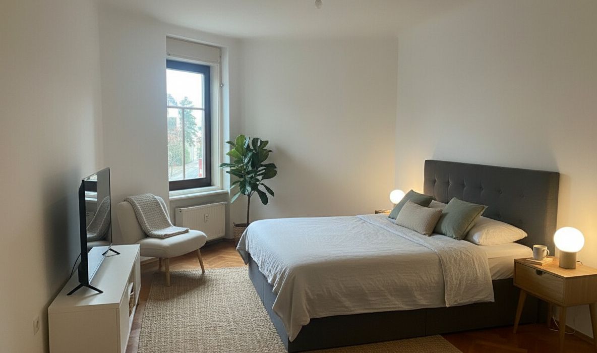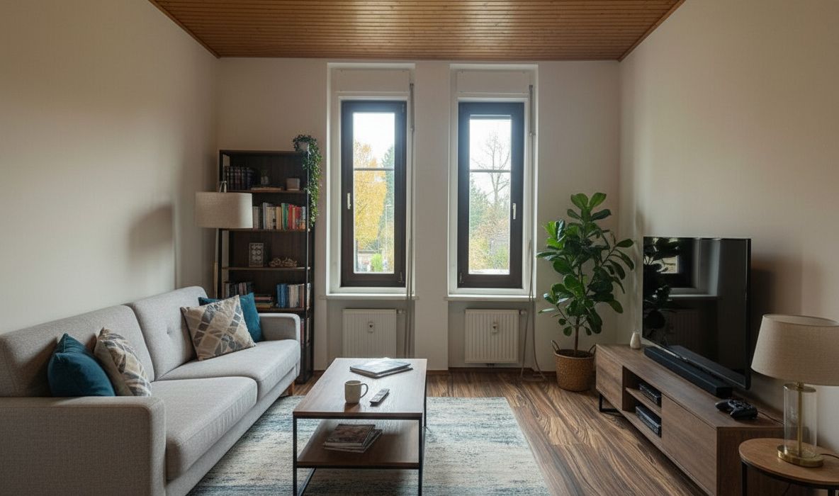 Die gezeigten Bilder sind Echtaufnahmen kombiniert mit KI generierten Einrichtungsvorschlägen.