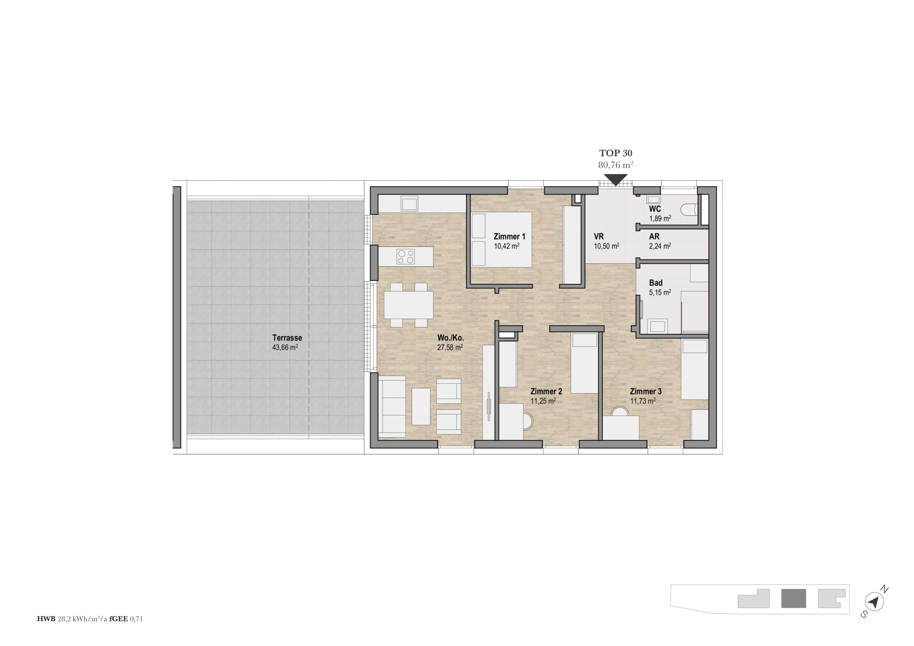 Es werden 23 klassische Wohnungen sowie 3 exklusive Penthouse-Wohnungen mit Wohnflächen ab 30 m² errichtet. Die 1- bis 4-Zimmer-Wohnungen überzeugen mit durchdachten Grundrissen und bieten eine behagliche Wohnatmosphäre. Die Einheiten verfügen über eine eigene Freifläche , sei es ein Balkon, eine Terrasse oder ein Privatgarten , die zusätzlichen Wohnkomfort im Freien ermöglichen.