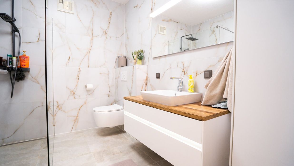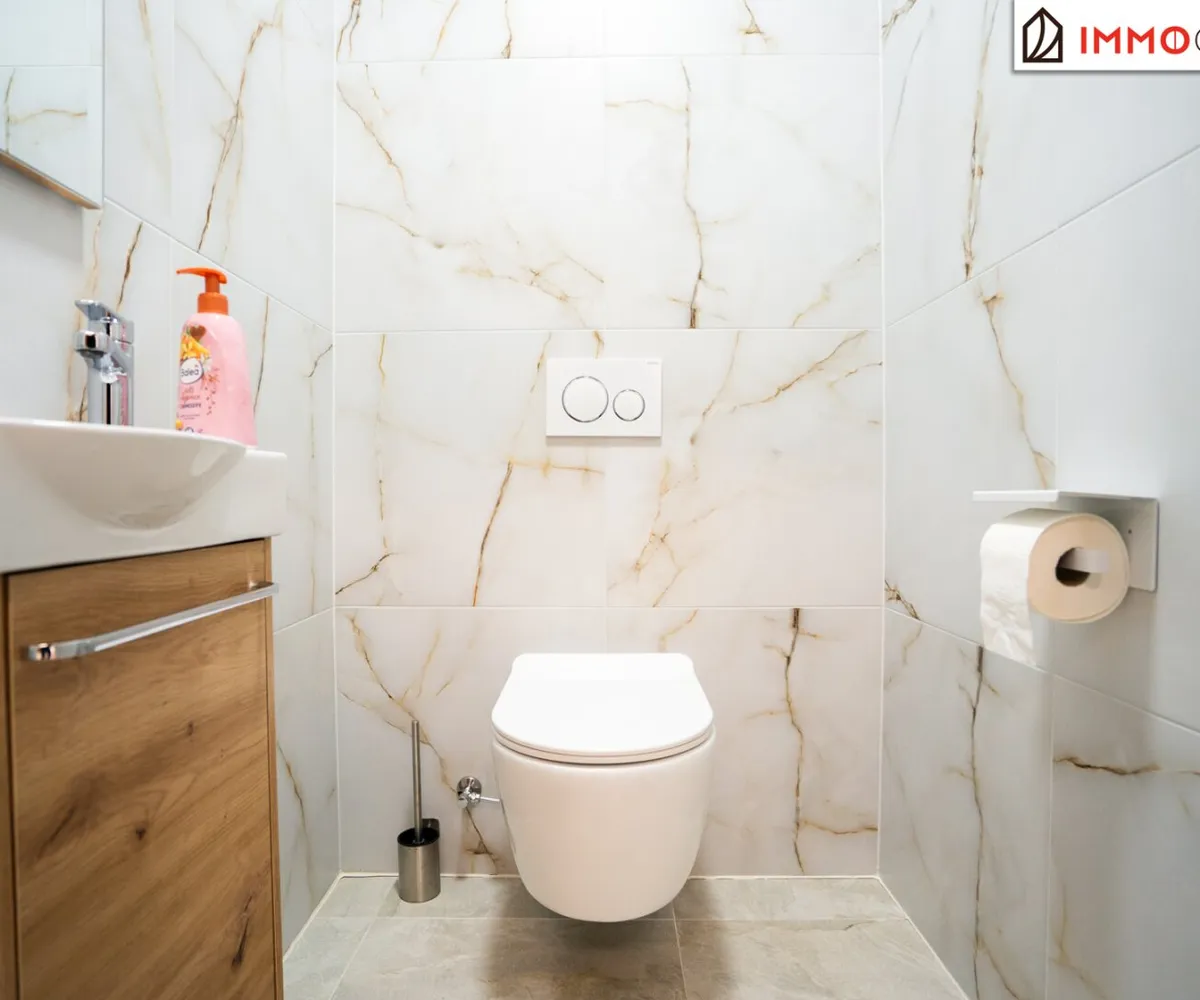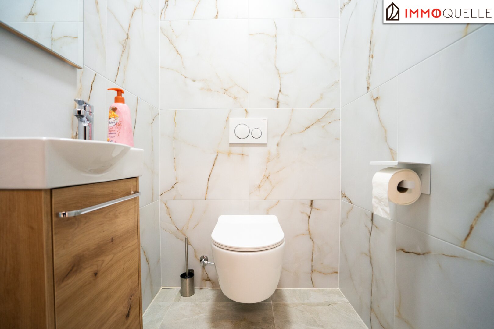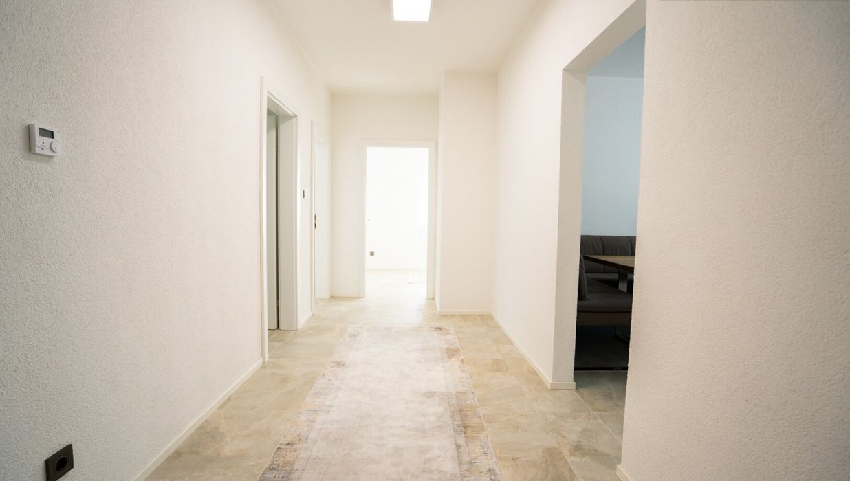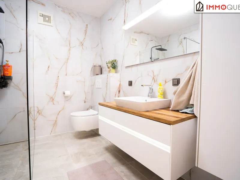 Bereits beim Eintreten fällt die angenehm offene Raumaufteilung auf: Der zentral gelegene Flur verbindet alle Räume barrierefrei miteinander – ganz ohne verwinkelte Übergänge. Rechts liegen das separate WC , ein praktischer Abstellraum sowie das hochwertige Badezimmer mit barrierefreier Dusche und WC. Helle Fliesen, moderne Armaturen und der durchdachte Schnitt sorgen für Komfort auf hohem Niveau.
