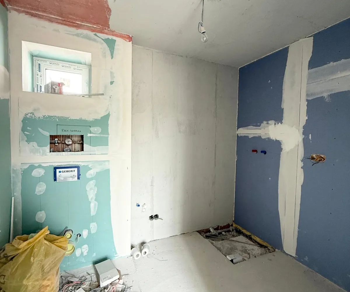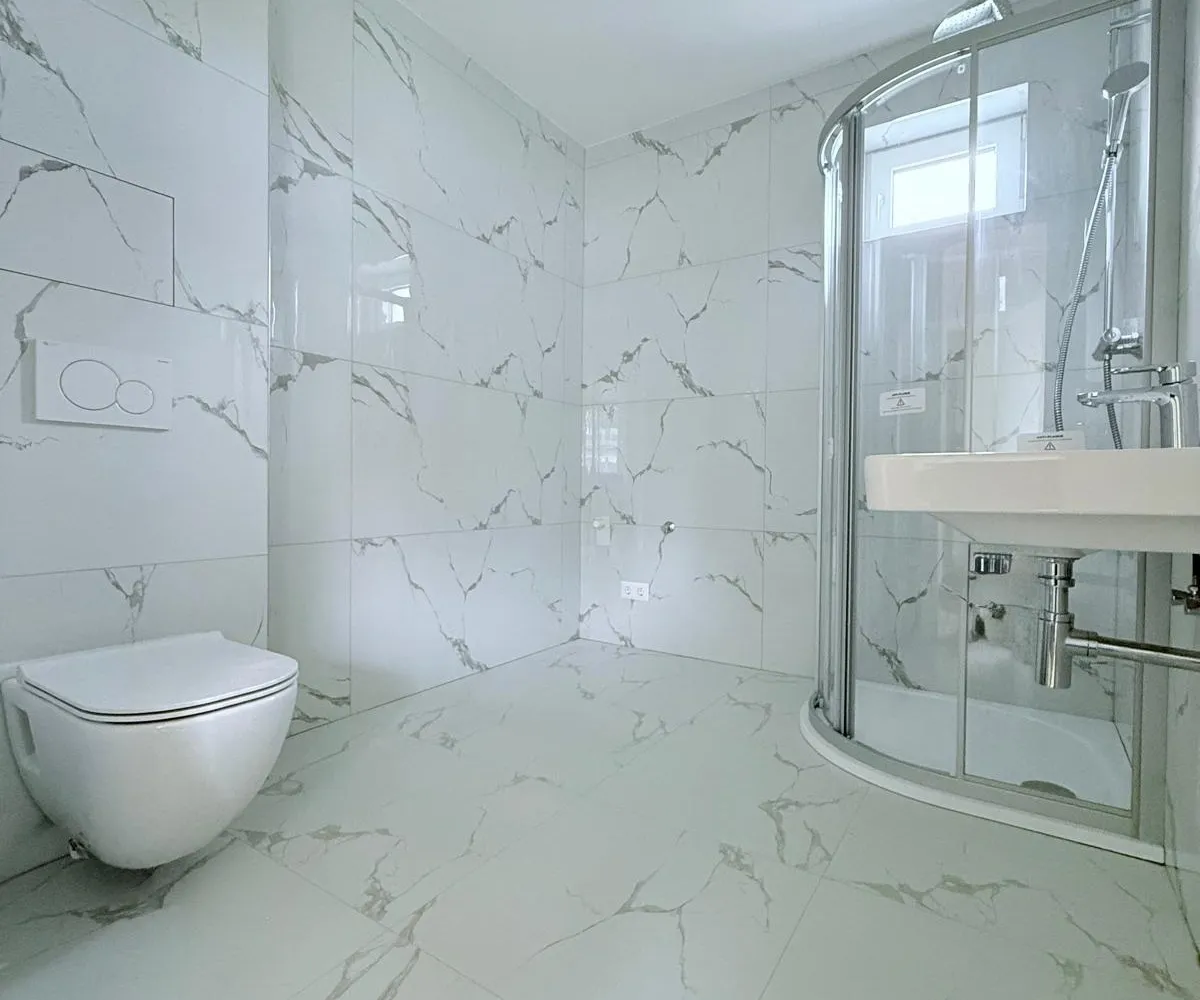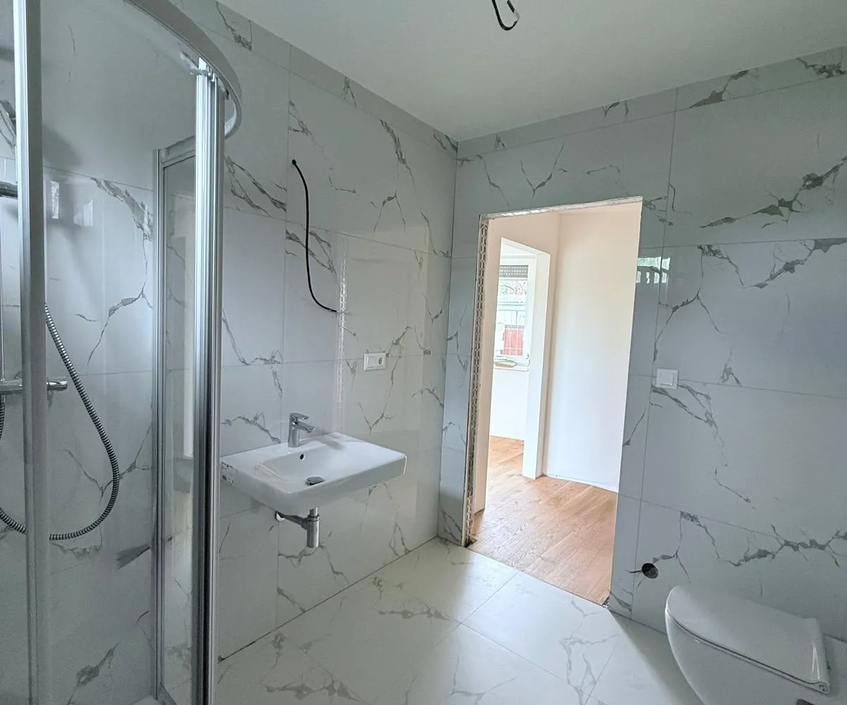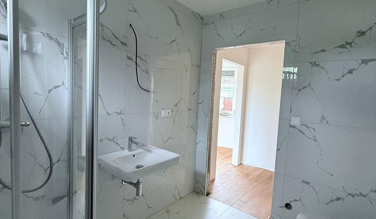 Ebenso zur hochwertigen Ausstattung gehört Parkettboden im Wohnbereich, ein mit Marmor verfliestes Badezimmer mit Dusche, Waschbecken und WC und eine nagelneue Einbauküche mit Geräten.