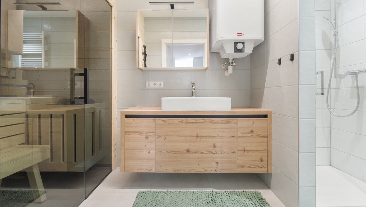 Die private Sauna im modernen Badezimmer ergänzt das Konzept um einen Ort der Entspannung nach aktiven Tagen am Berg.