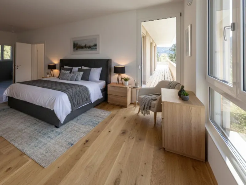 Die hochwertige Ausstattung umfasst elegante Fliesen und edles Parkett, eine moderne Einbauküche mit offener Wohnküche, die zum gemeinsamen Kochen und Verweilen einlädt. Für wohlige Wärme sorgt die effiziente Zentralheizung, unterstützt von einer umweltfreundlichen Luftwärmepumpe. Die Terrasse bietet zusätzlichen Raum zum Entspannen und Genießen der Sonne.