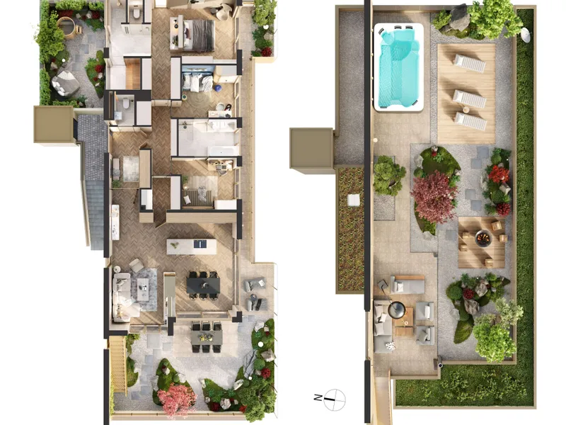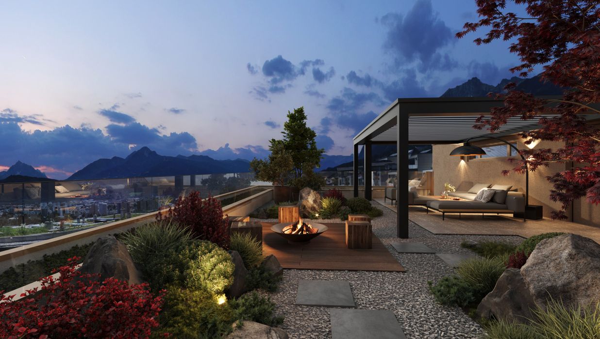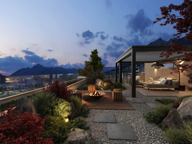 Das Herzstück bildet der großzügige Wohn-, Ess- und Kochbereich, der sich elegant zur Südterrasse öffnet. Die rund 86,5 m² große Dachterrasse sowie der atemberaubende 166,5 m² Dachgarten erweitern Ihr Zuhause nach draußen – perfekt für entspannte Stunden oder gesellige Abende mit Blick über die Stadt.