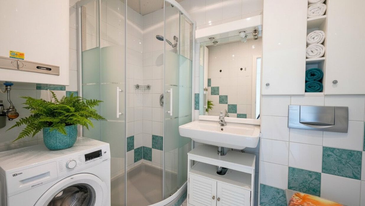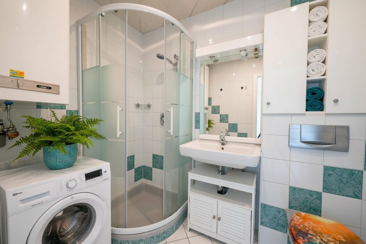 - Bad mit Dusche, Waschtisch, Waschmaschinenanschluss und WC