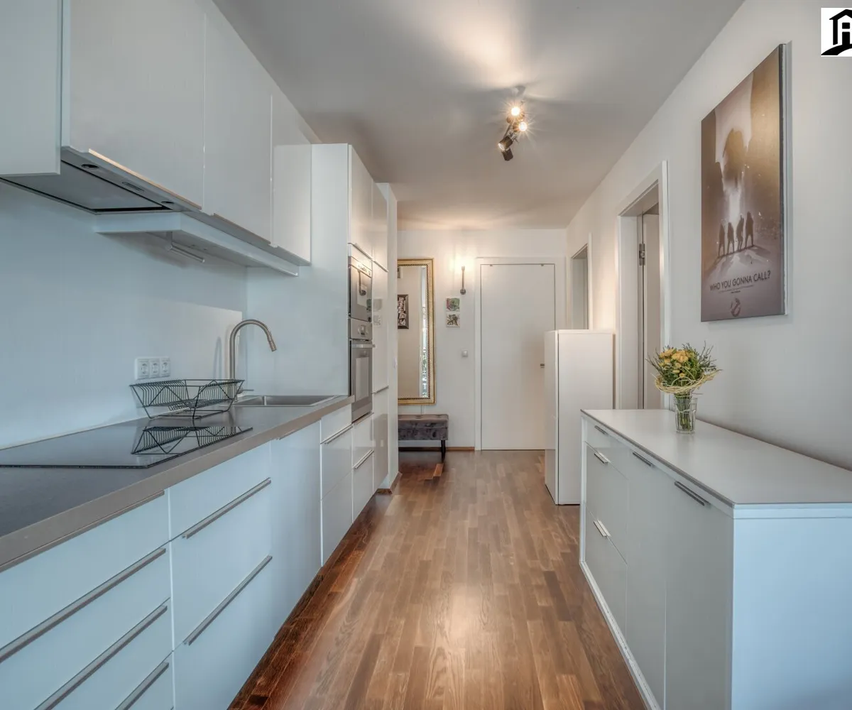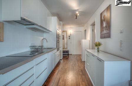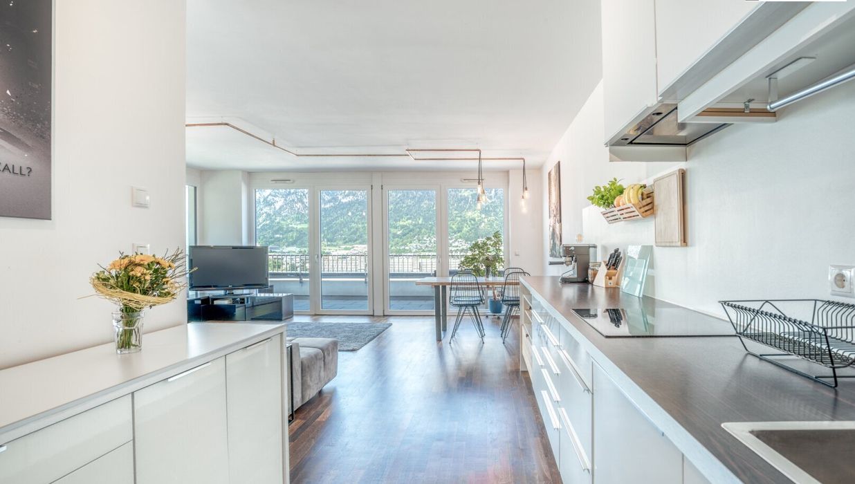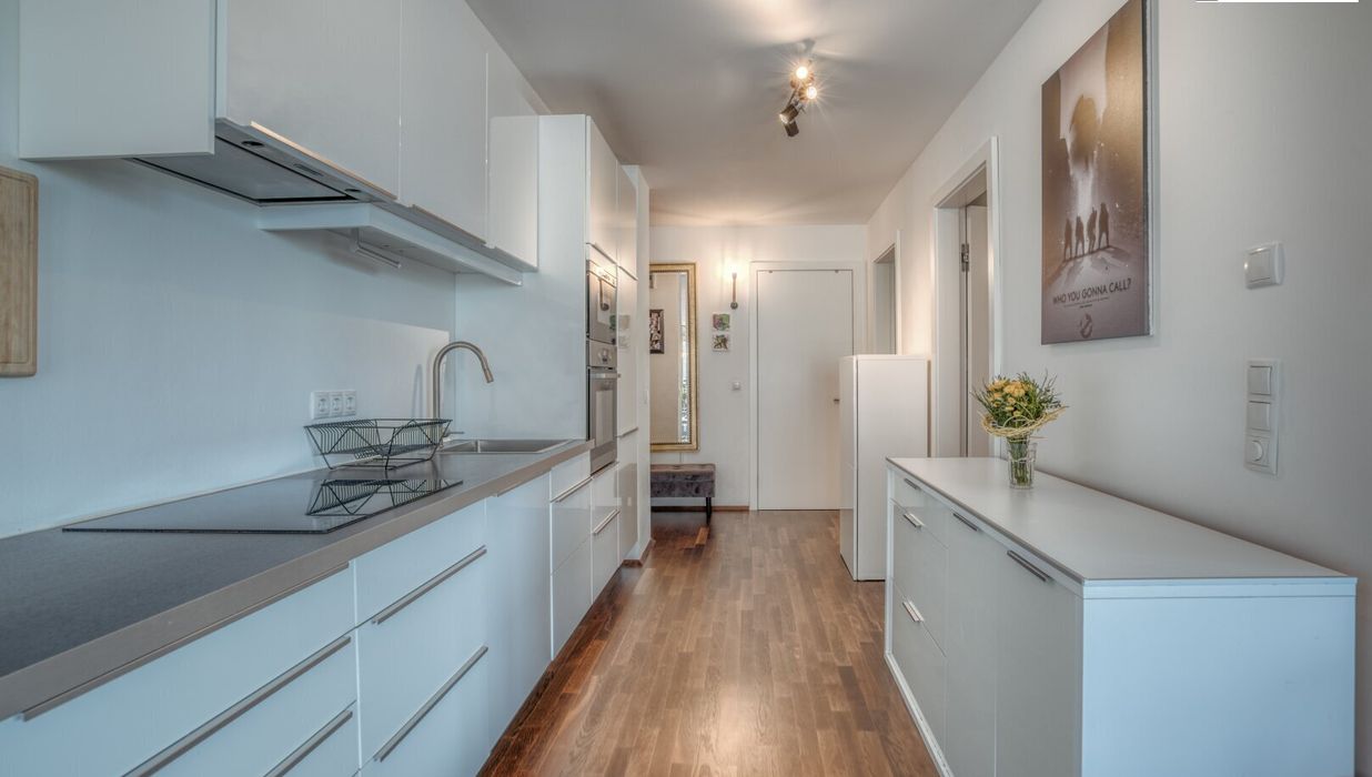 Die zeitlos gestaltete Küche fügt sich harmonisch in den offenen Wohnbereich ein. Beheizt wird die Wohnung über eine