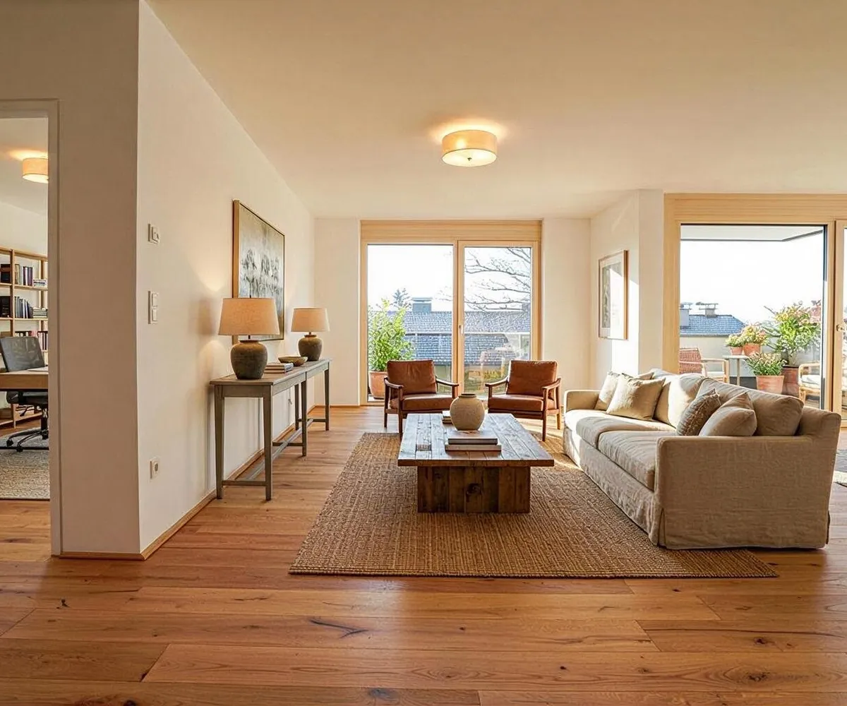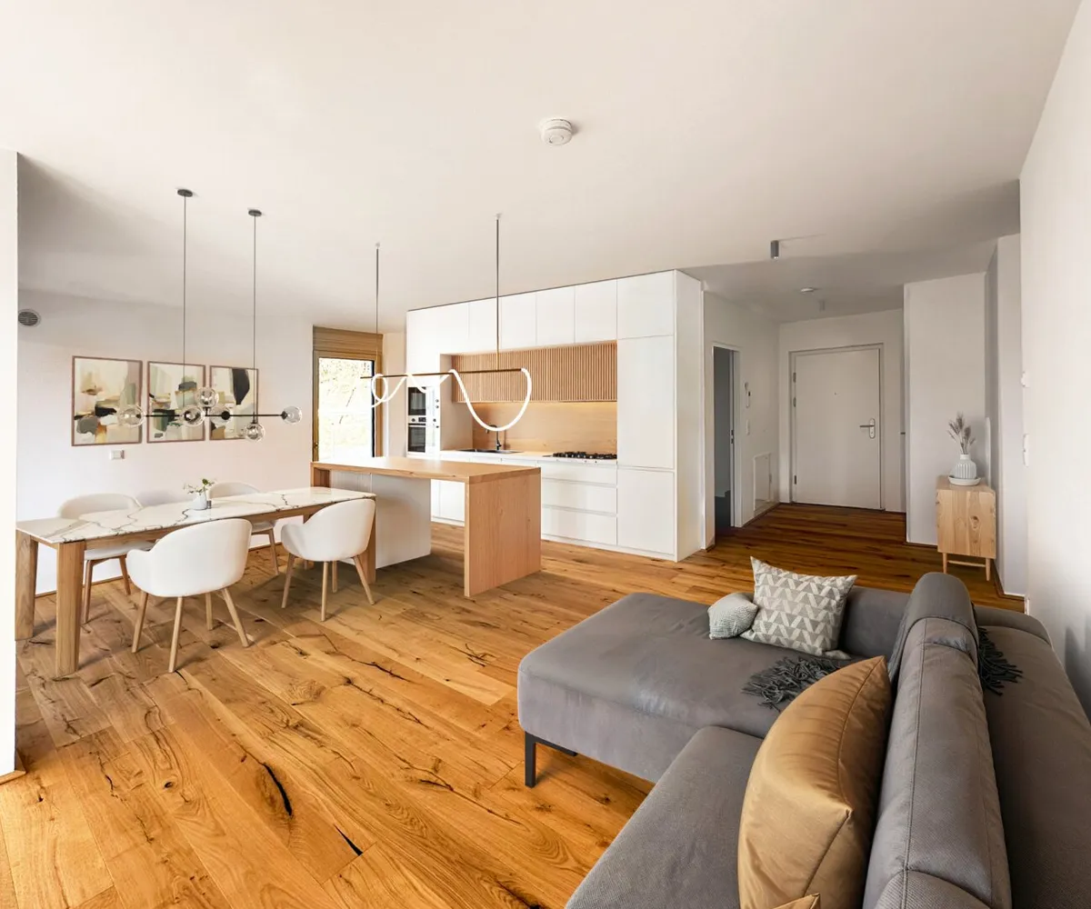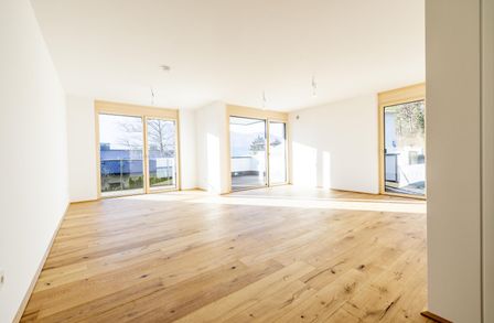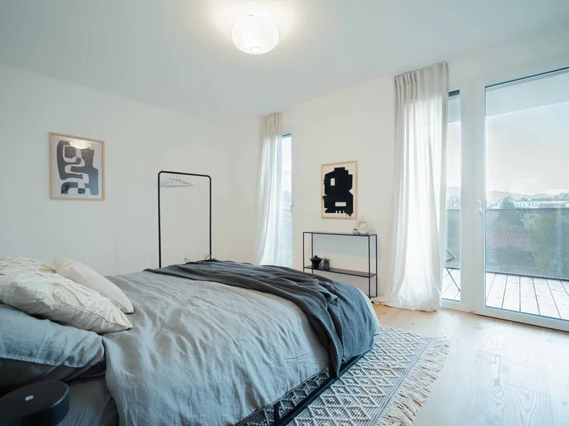 Die Wohnung überzeugt durch ihre großzügige Raumgestaltung und den hellen, offenen Wohnbereich. Bodentiefe Fenster schaffen ein lichtdurchflutetes Ambiente und unterstreichen das luftige Wohngefühl. Das Highlight ist die weitläufige Terrasse – ideal für entspannte Sonnenstunden oder gemütliche Abende mit Freunden. Die beiden Schlafzimmer bieten ausreichend Platz und Flexibilität – ob als Schlaf-, Arbeits- oder Gästezimmer.