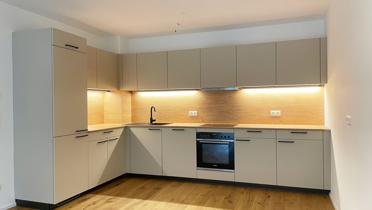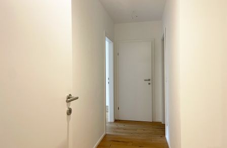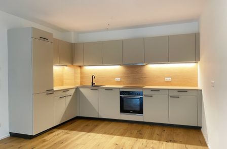 Die Wohnungen sind großzügig geschnitten und zeichnen sich durch sehr intelligente Grundrissgestaltung aus. Alle Wohnungen verfügen über hochwertige Dielenböden in den Wohnräumen, großformatiges Feinsteinzeug in den Nebenräumen und Bädern, externen Sonnenschutz, Fußbodenheizung und eine Sommer-Temperierung. Die Küche ist in der Wohnung nicht möbliert.