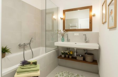 • Großformatiges Feinsteinzeug in den Bädern und Nebenräumen