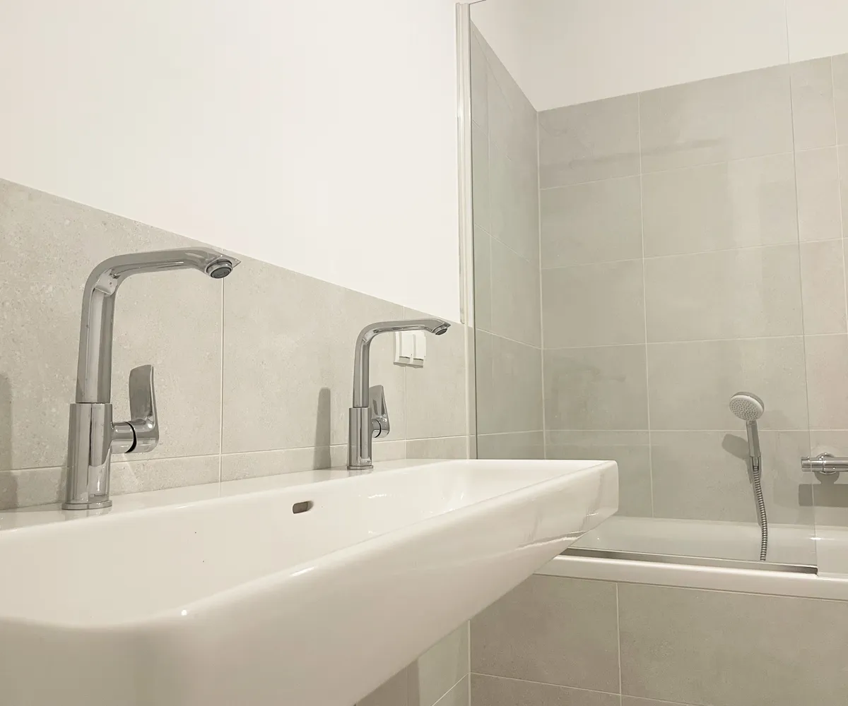 • Großformatiges Feinsteinzeug in den Bädern und Nebenräumen