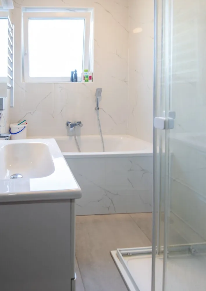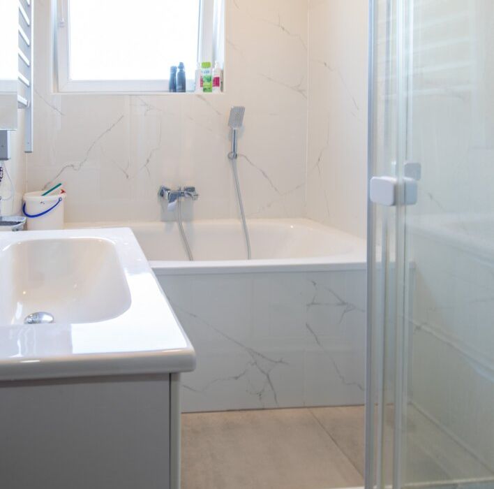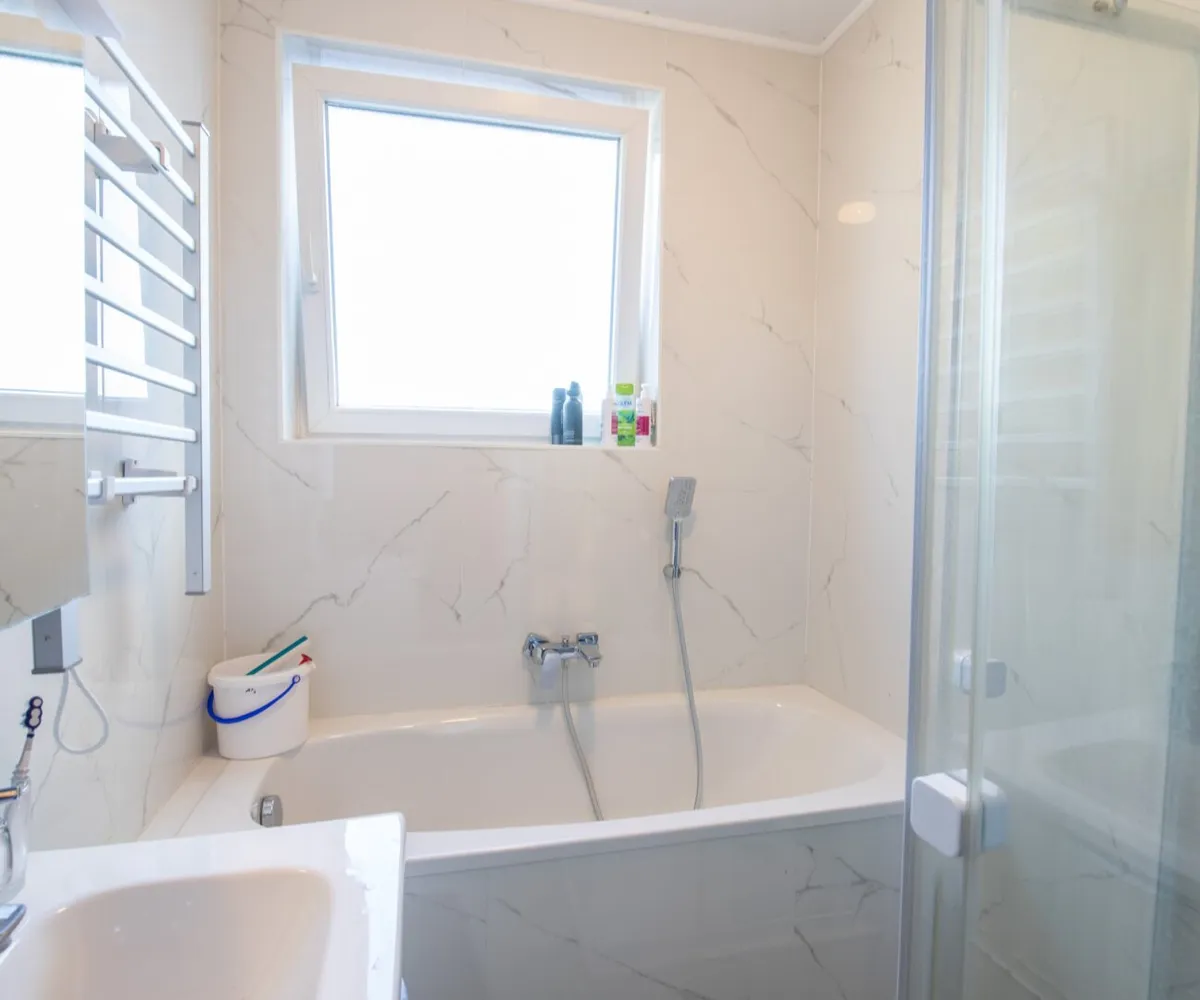 - Bad mit Dusche, Wanne, Waschtisch, WM-Anschluss und WC