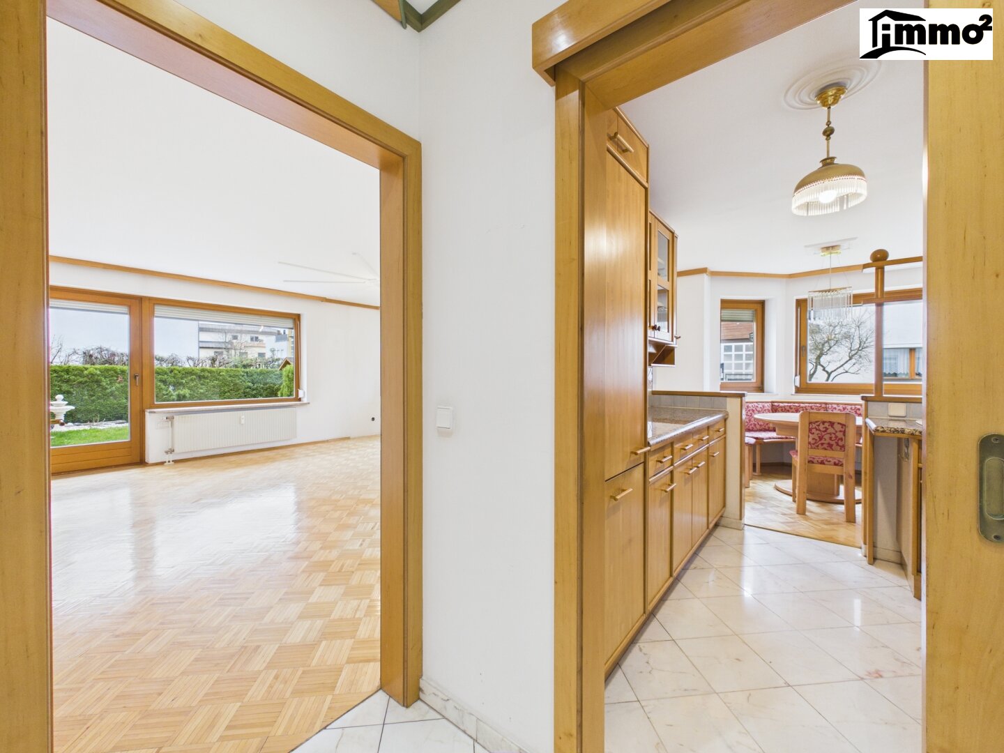 Vorraum, großzügiges Wohnzimmer mit Zugang zur Terrasse und in den Garten, separate Küche, Schlafzimmer, weiteres Zimmer, begehbarer Kleiderschrank, Badezimmer mit Wanne und Dusche, Abstellraum.