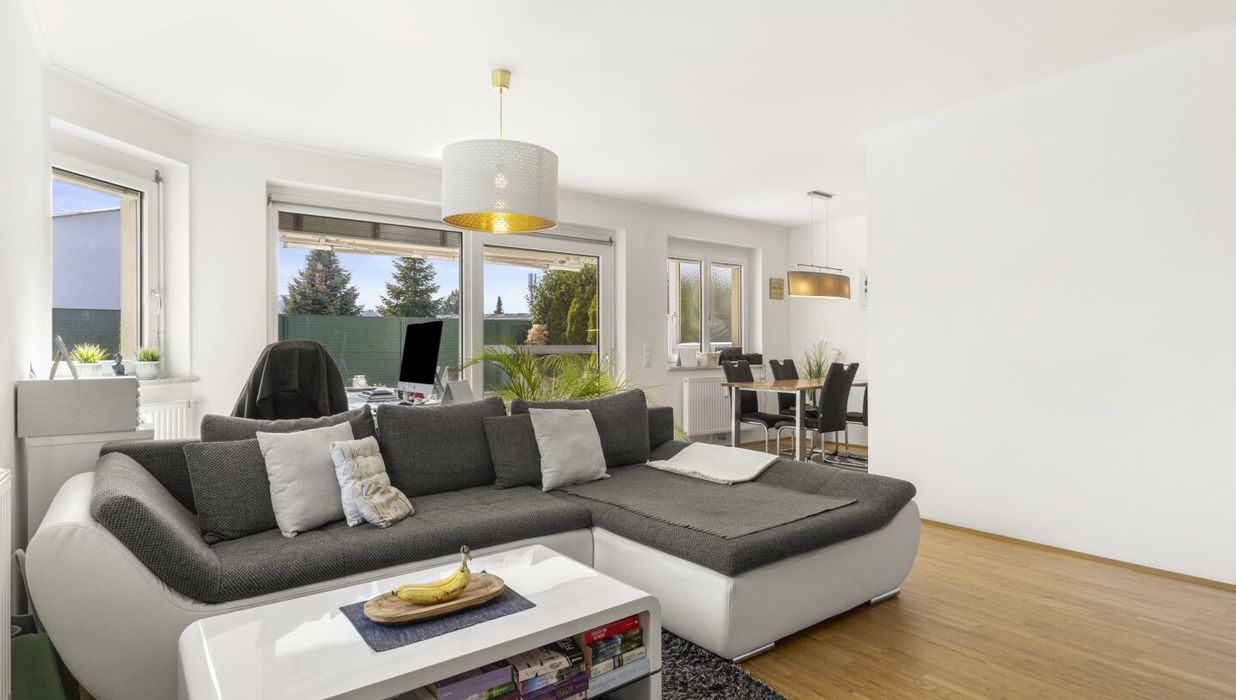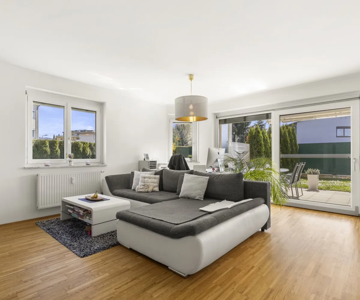 Wohn-/Nutzfläche ca.: 91,89m² inkl. ca. 7,99m² Loggia plus ca. 9,17m² Südterrasse, plus ca. 400m² XL-Eigengarten.