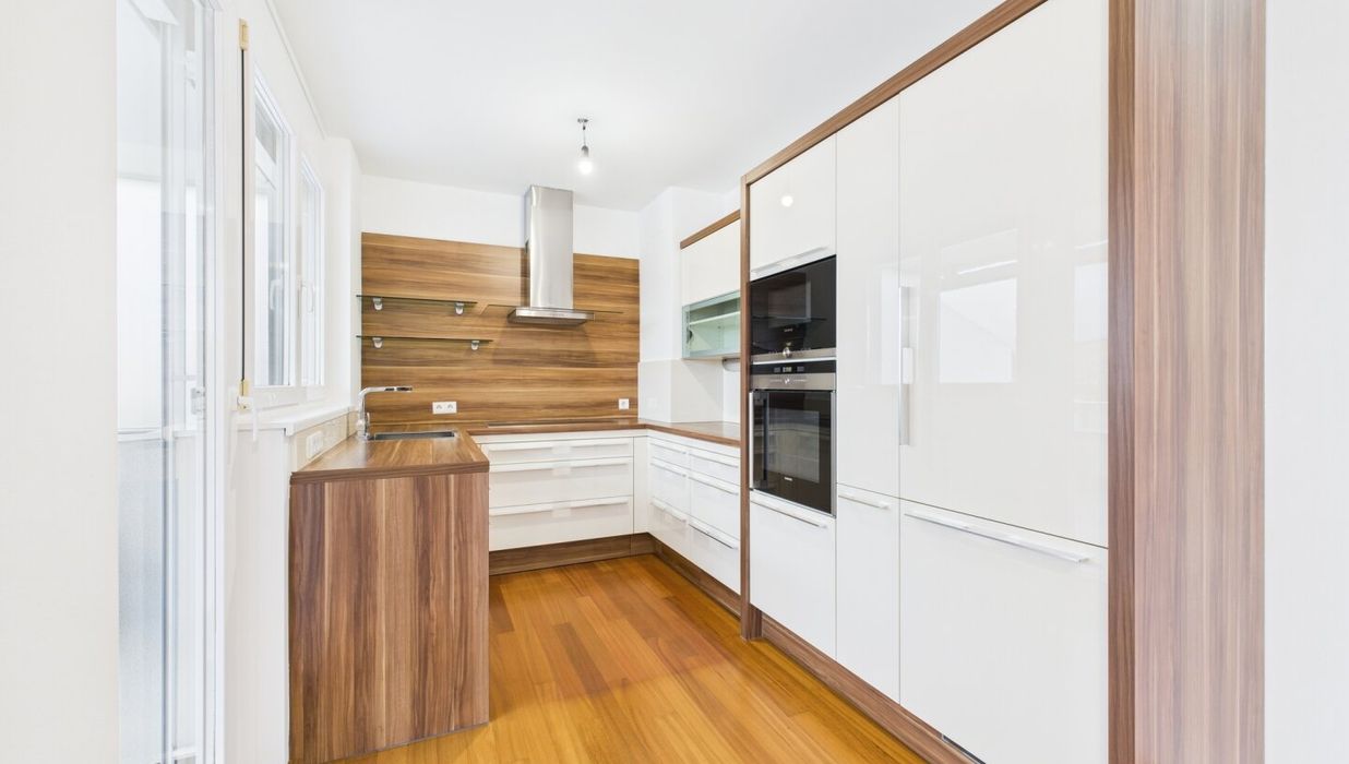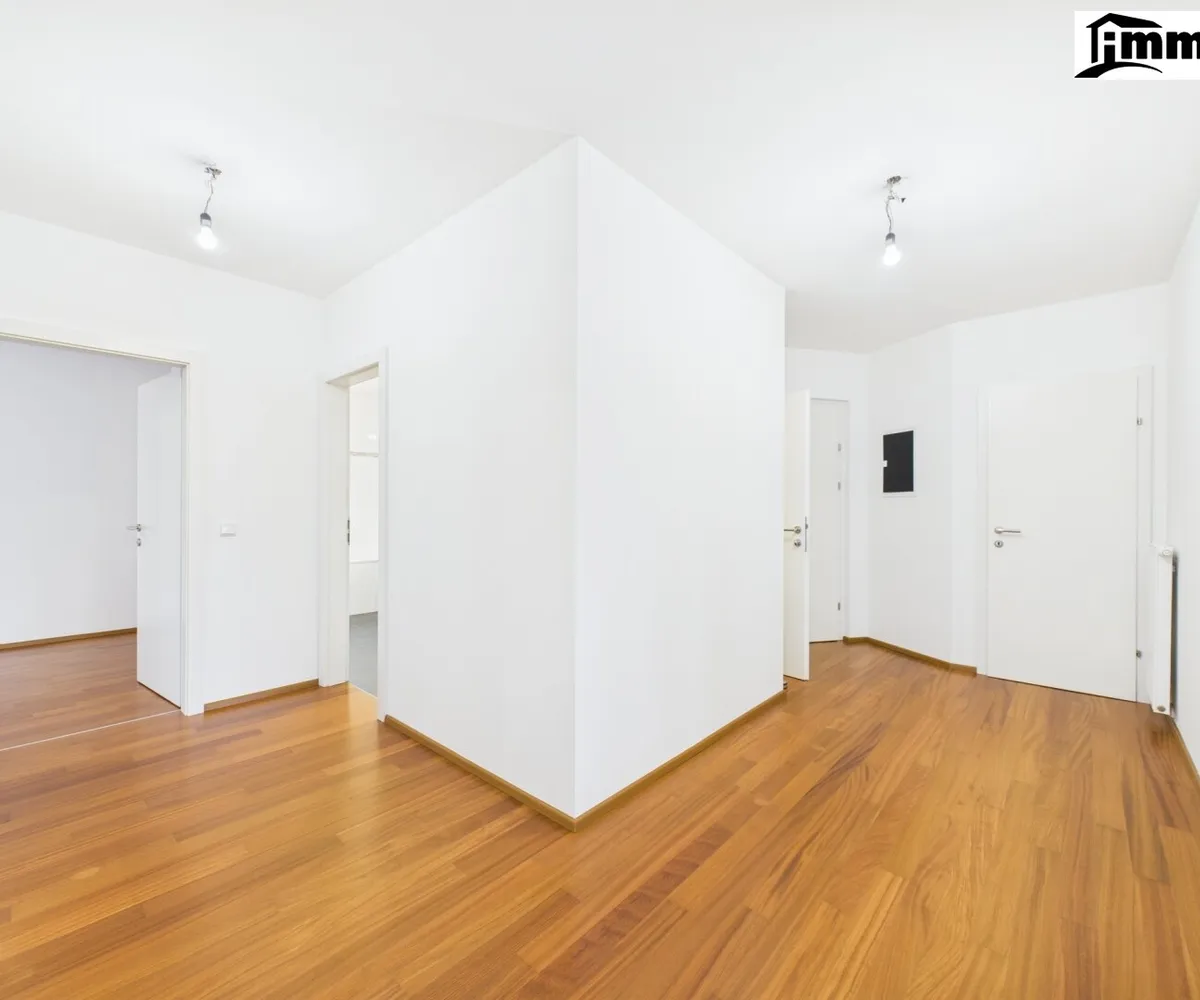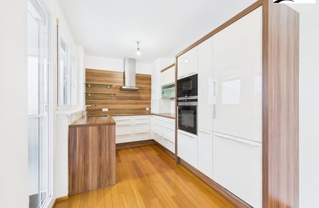 Die weitläufigen Räume sind mit edlem afrikanischem Parkett ausgestattet und schaffen eine warme, elegante Atmosphäre. Der große Wohn-Essbereich mit Zugang zum Balkon lädt zum Wohlfühlen ein und bildet das Herzstück der Wohnung. Eine hochwertige Dan-Küche mit moderner Ausstattung erfüllt höchste Ansprüche an Funktionalität und Design.