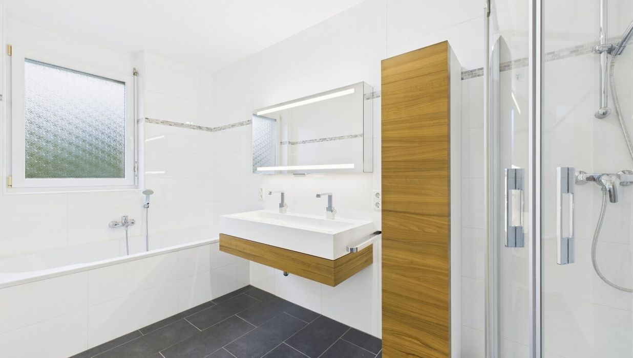 Helles Badezimmer mit Fenster, Dusche & Badewanne