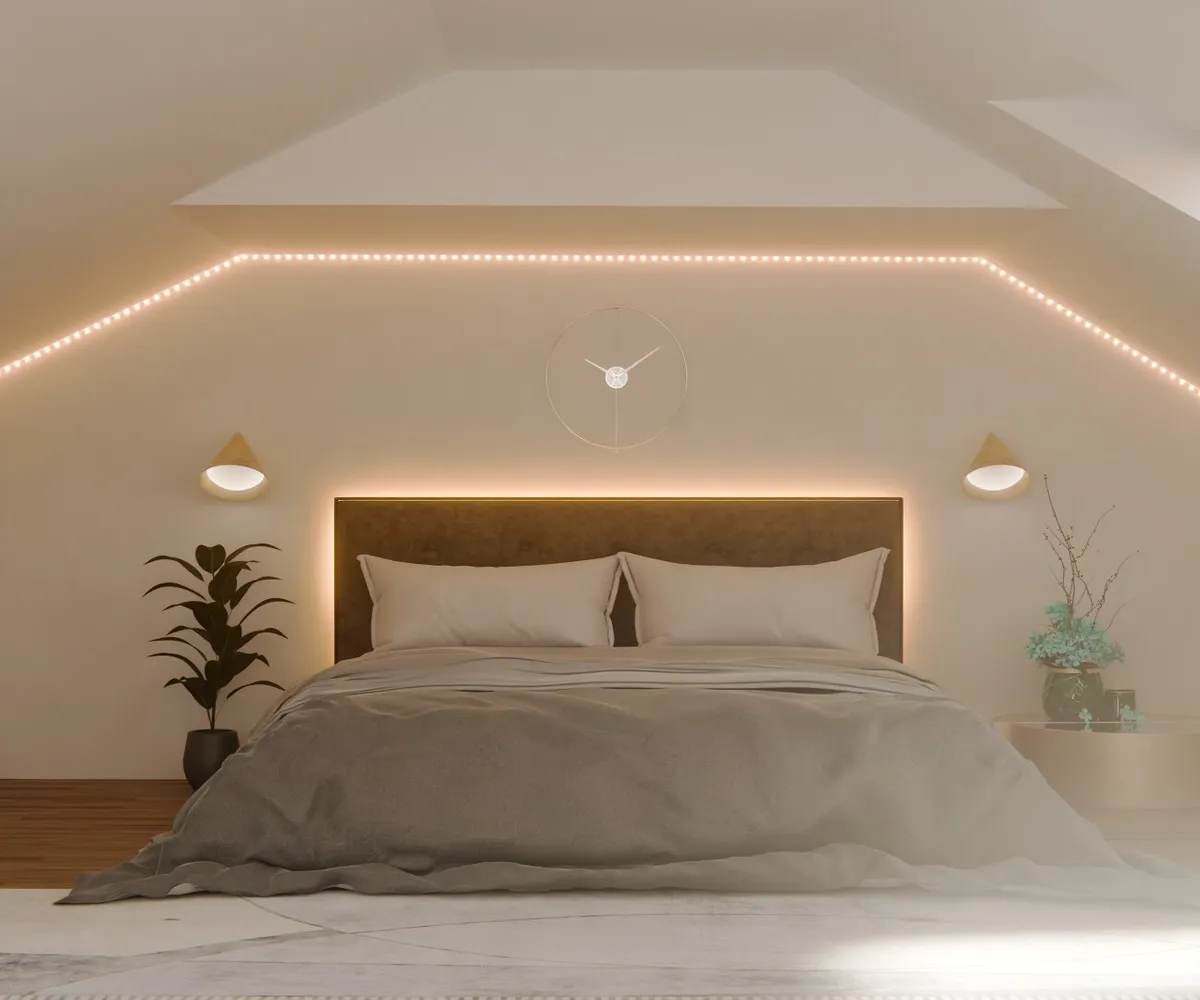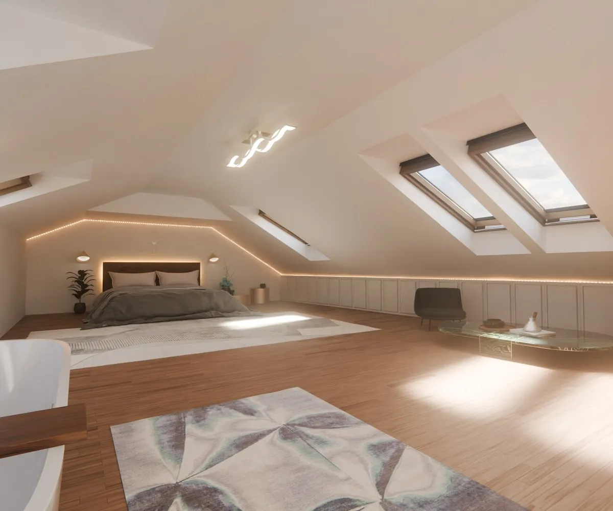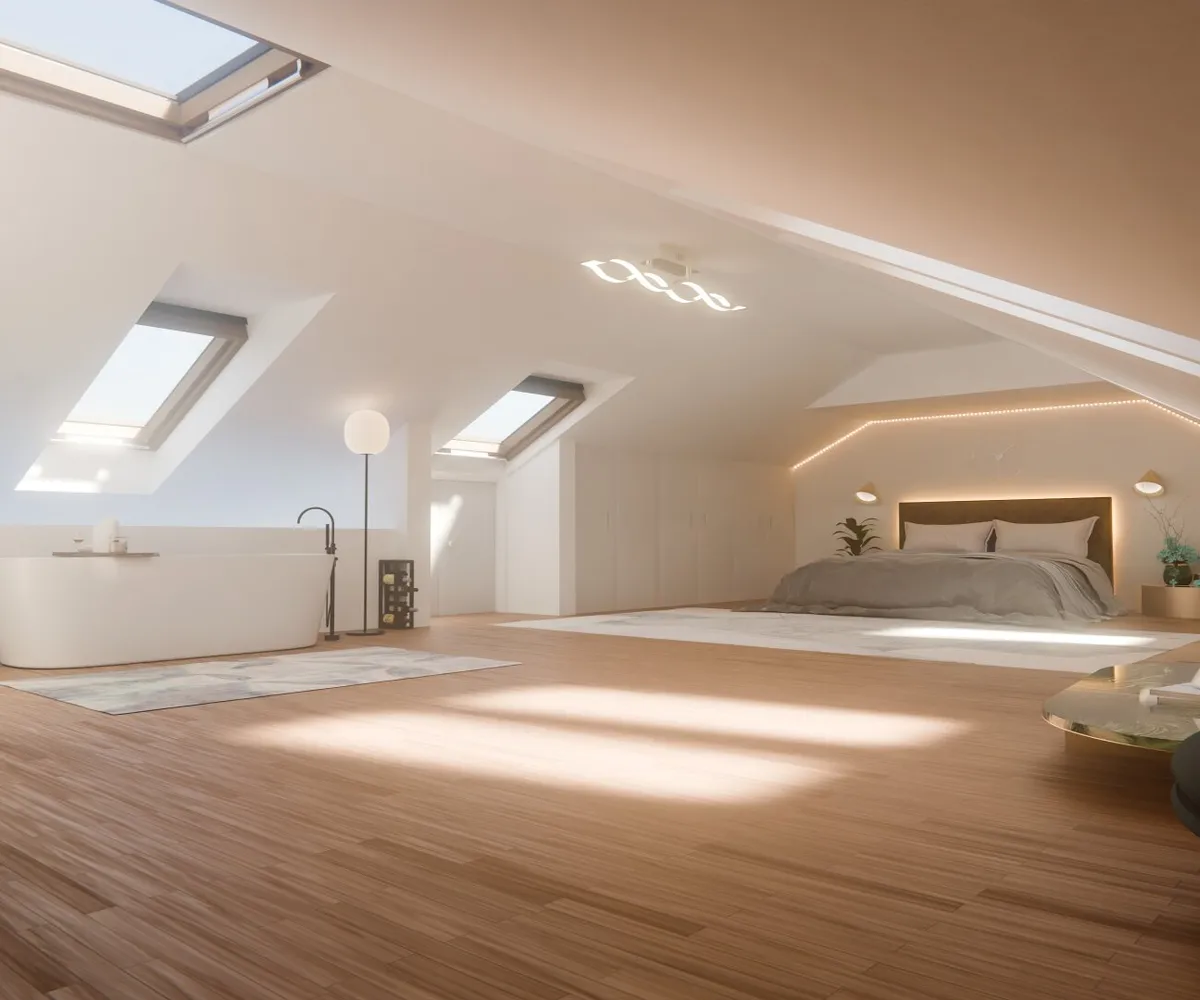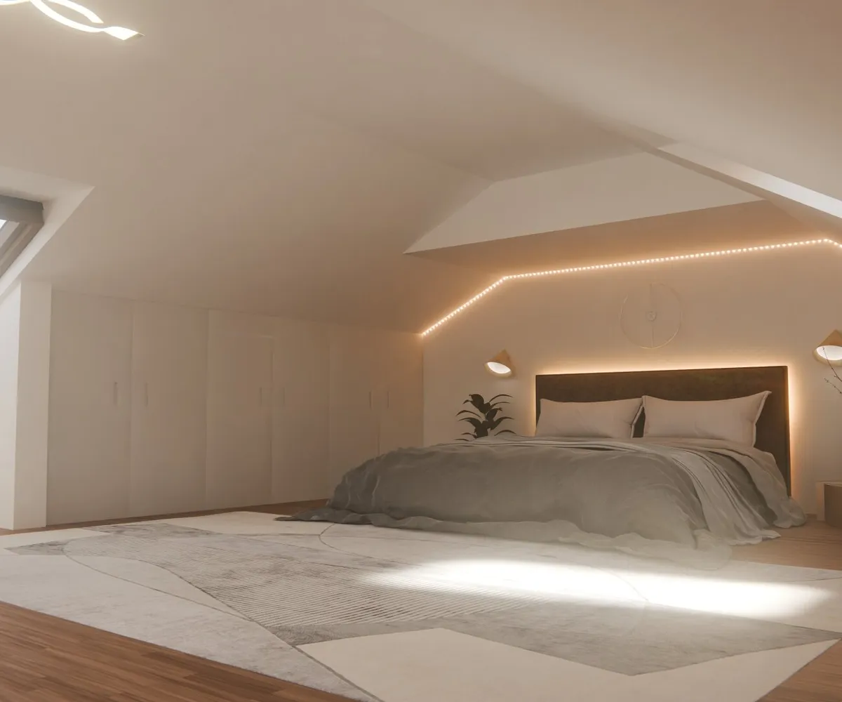 Eine elegante Treppe führt Sie in den oberen Bereich der Wohnung. Hier finden Sie ein Schlafzimmer mit einem kleinen Badezimmer mit Dusche. Die Fotos wurden neu visualisiert und ein großer Raum dargestellt um dieses Potenzial greifbar zu machen.