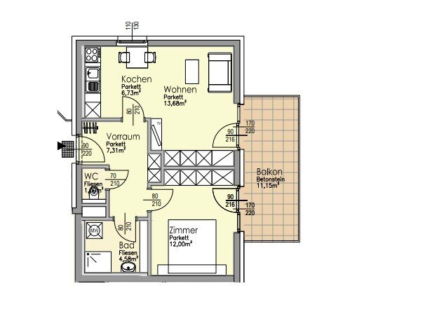 Die Wohnung überzeugt durch eine durchdachte Raumaufteilung, eine voll ausgestattete Einbauküche sowie einen nach Osten ausgerichteten Balkon, der angenehme Morgensonne bietet. Das Wohnhaus ist mit einem Lift ausgestattet, die Beheizung erfolgt über Fernwärme. Kabel- und Satelliten-TV sowie Breitbandinternet sind vorhanden.