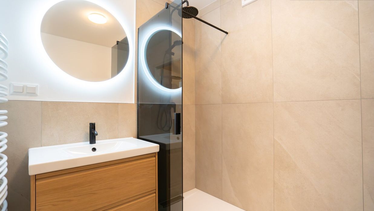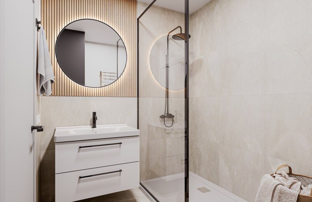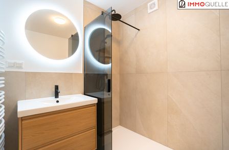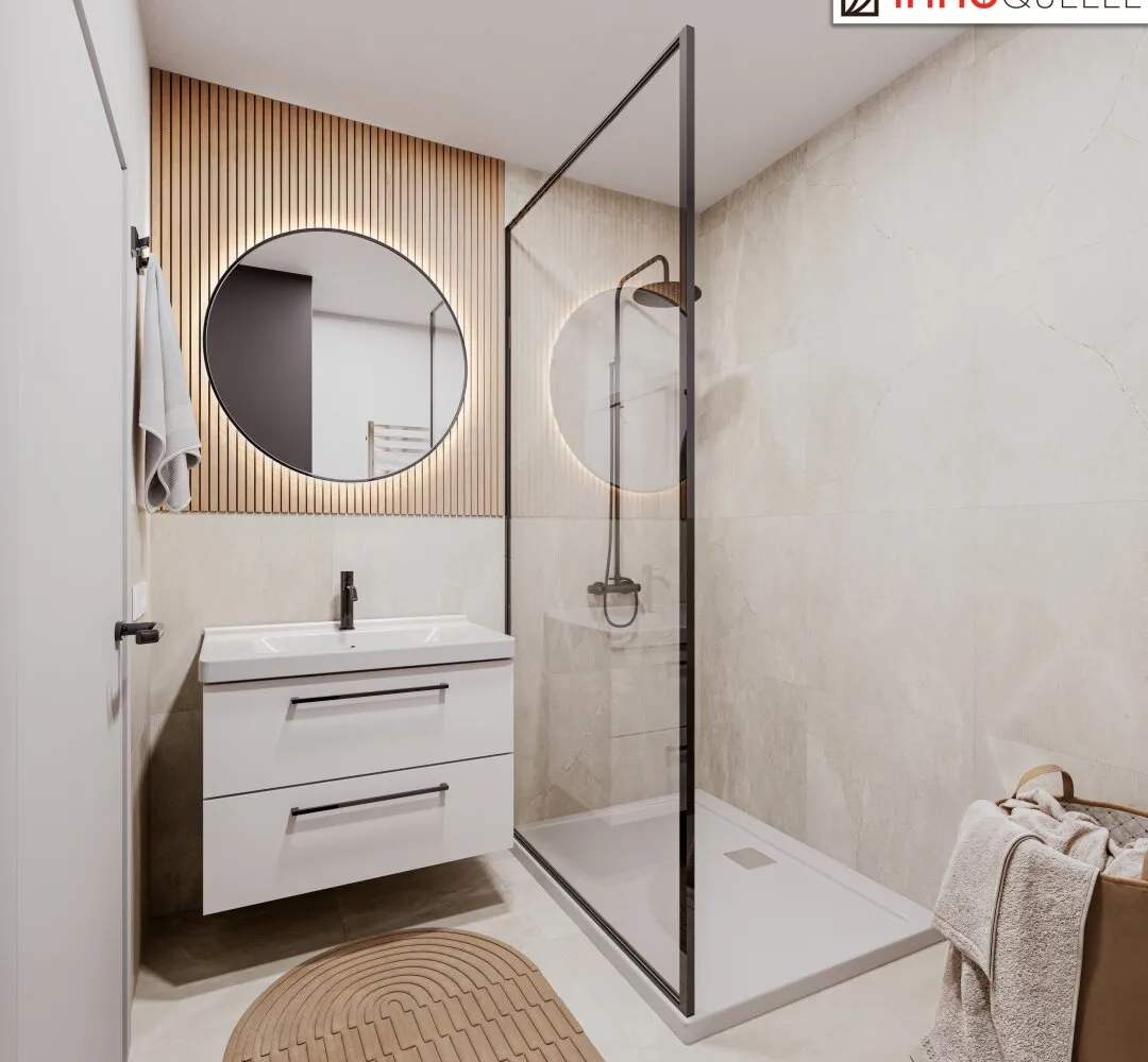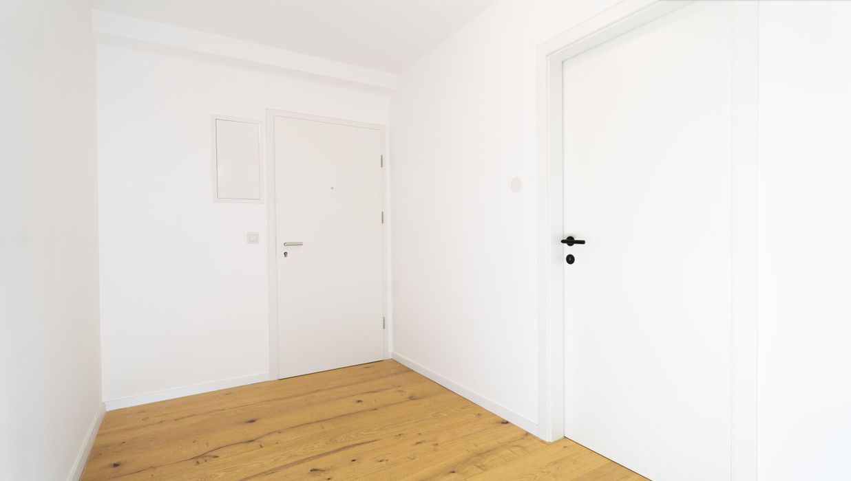 Schon beim Betreten fällt die klare Struktur der Wohnung ins Auge: Der zentrale Vorraum erschließt alle Räume und sorgt für kurze Wege im Alltag. Gleich rechts befindet sich ein elegantes Badezimmer mit begehbarer Dusche, Handtuchheizkörper und Waschmaschinenanschluss. Daneben ein separates WC – dezent positioniert für maximale Privatsphäre.